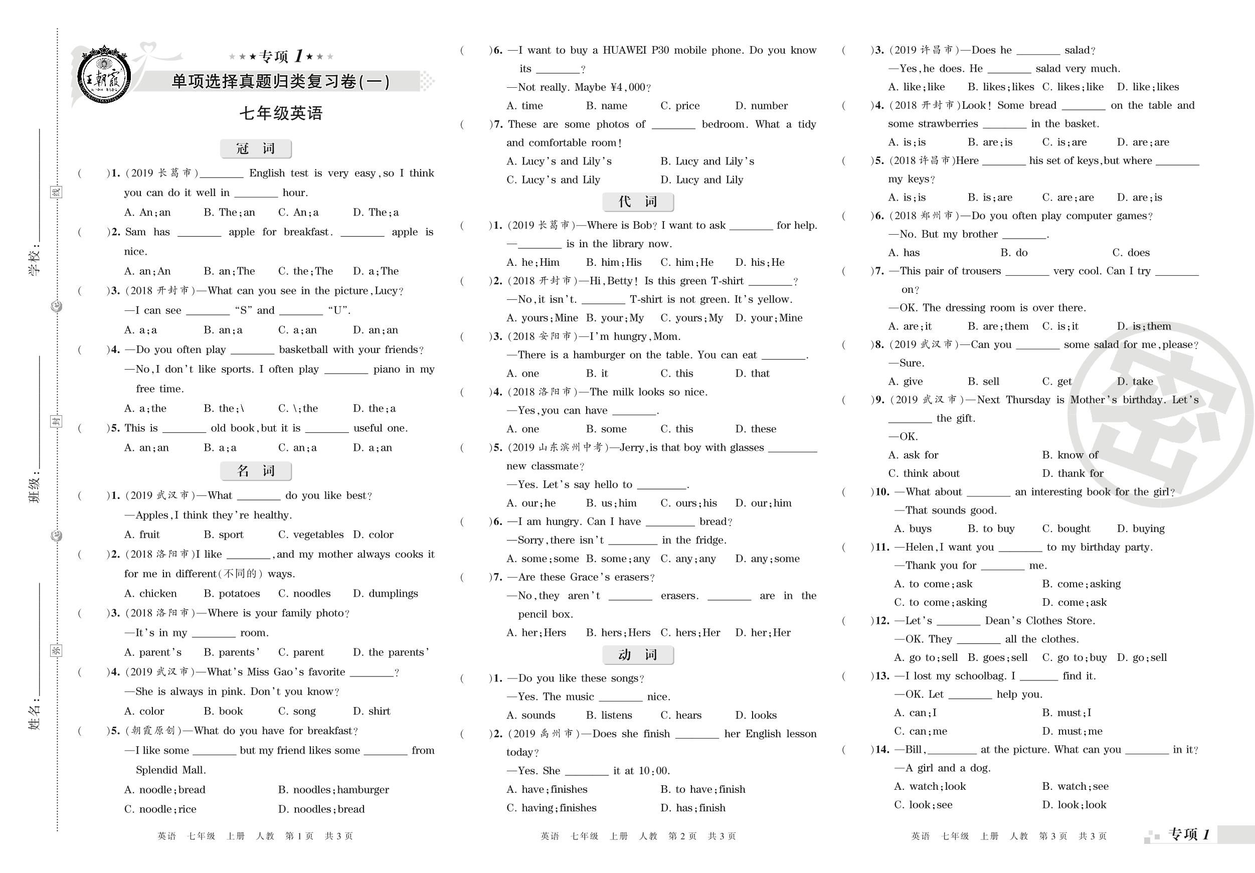 王朝霞期末专项卷——单项选择真题归类复习七年级上册英语(人教版)_R210807195757【0】