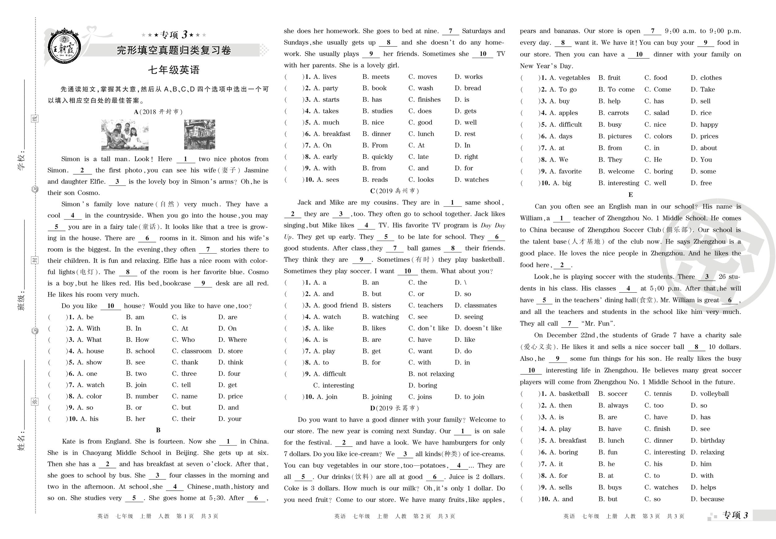 王朝霞期末专项卷——完形填空、选择型阅读真题归类复习七年级上册英语(人教版)_R210807195801【0】