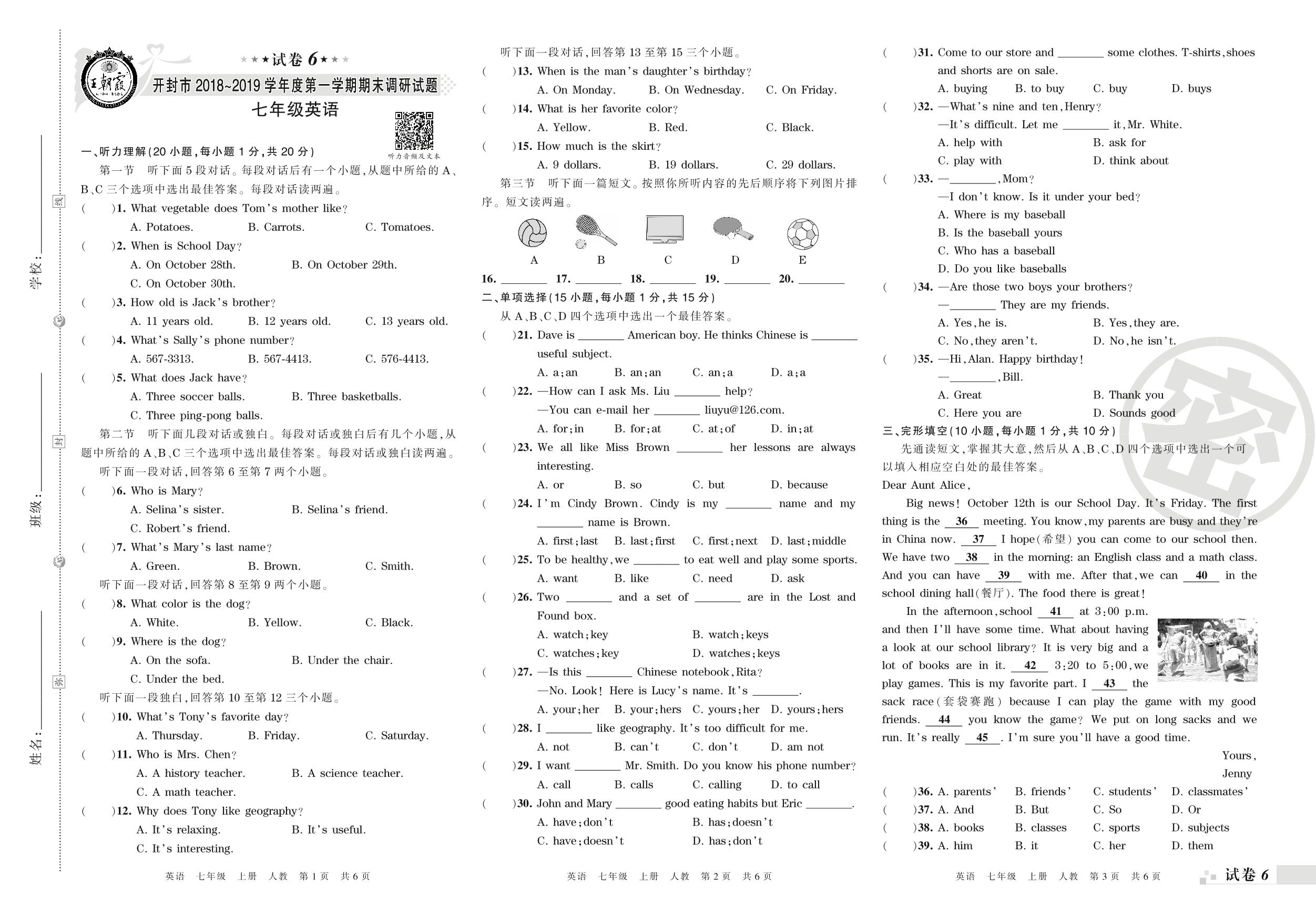2018-2019学年第一学期开封市七年级英语试卷(人教版)【6】
