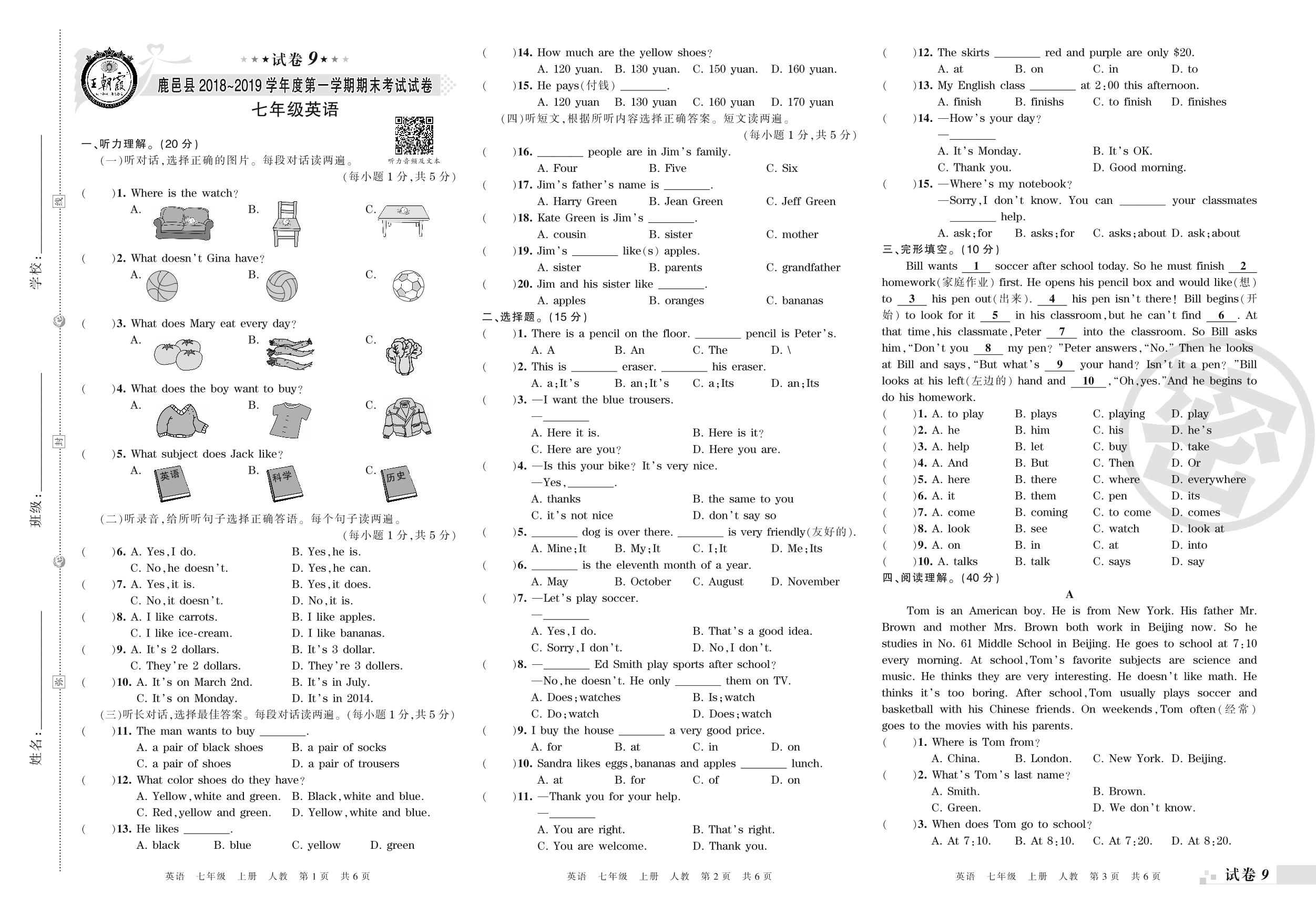 2018-2019学年第一学期周口市鹿邑县七年级英语试卷(人教版)【9】