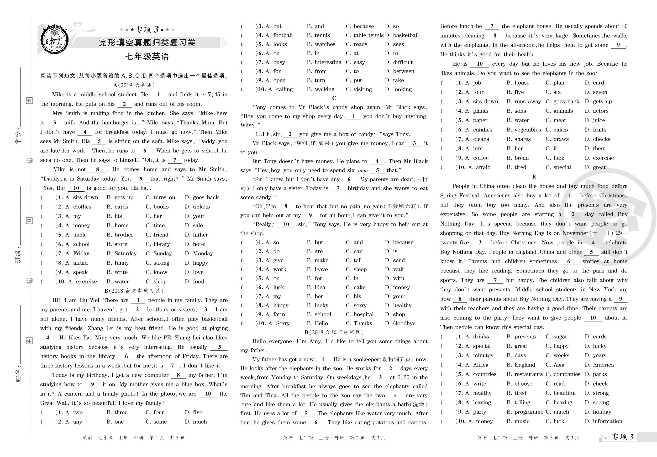 王朝霞期末专项卷——完形填空、任务型阅读真题归类复习七年级上册英语(外研版)_R210807195930【0】