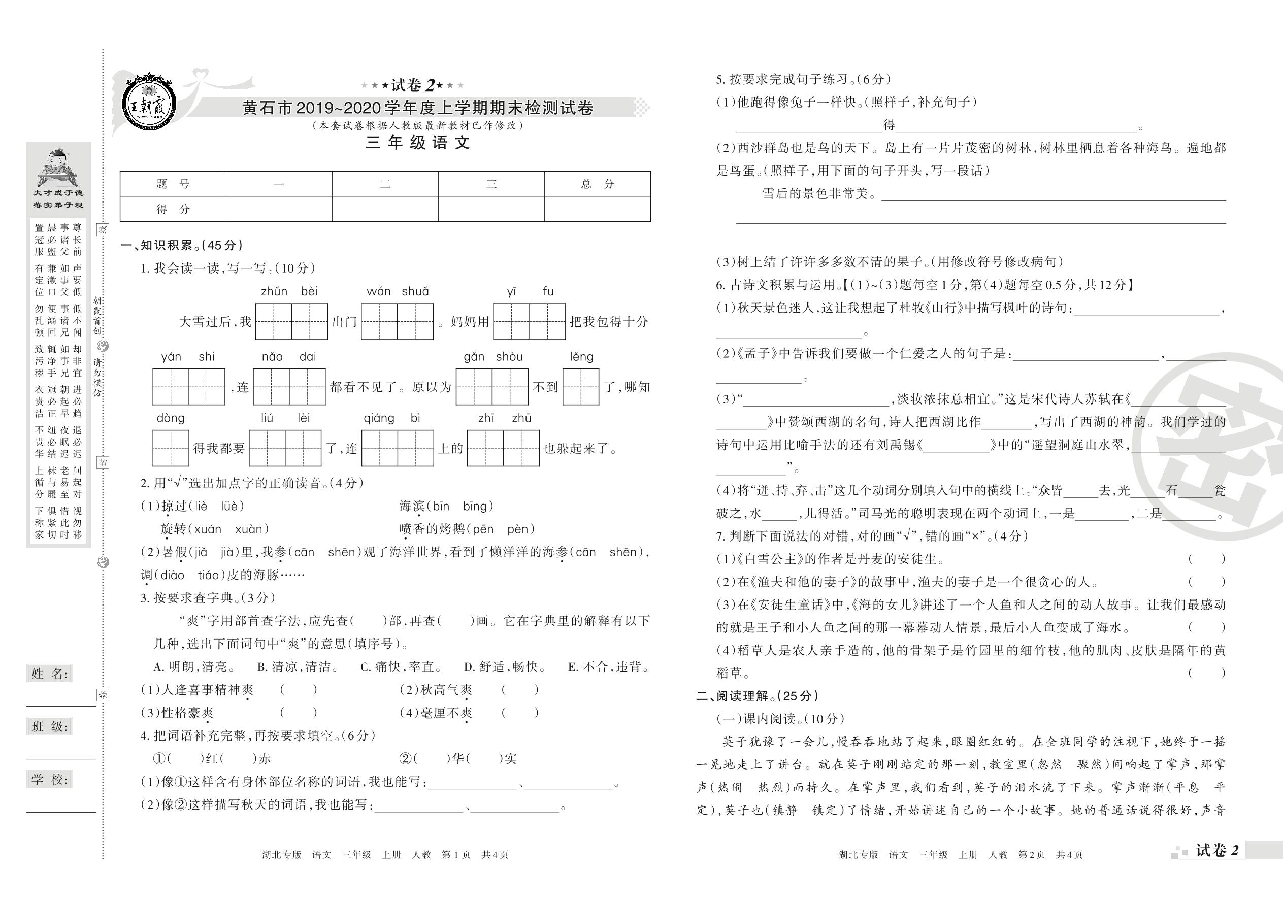 2019-2020学年第一学期黄石市三年级语文试卷(人教版)【2】