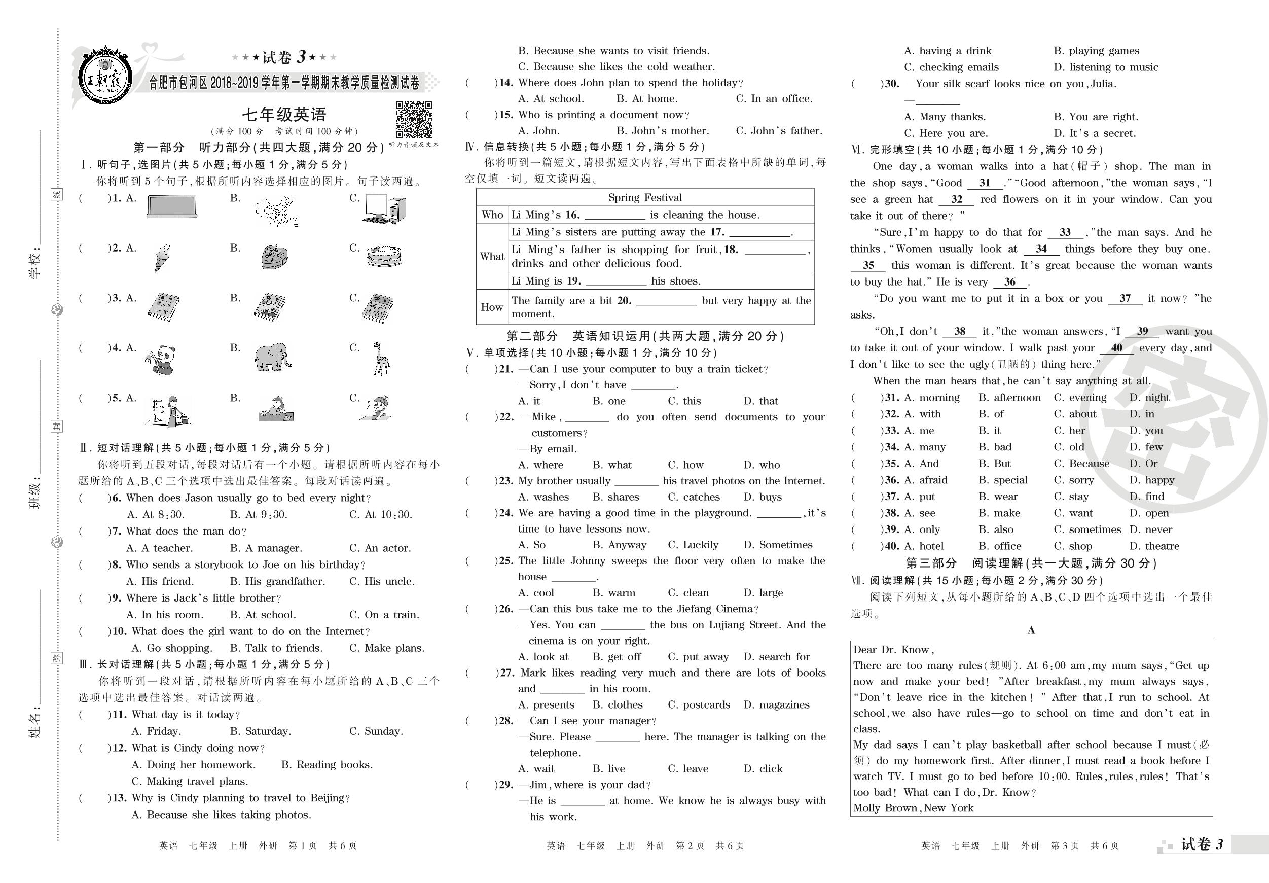 2018-2019学年第一学期合肥市包河区七年级英语试卷(外研版)【3】