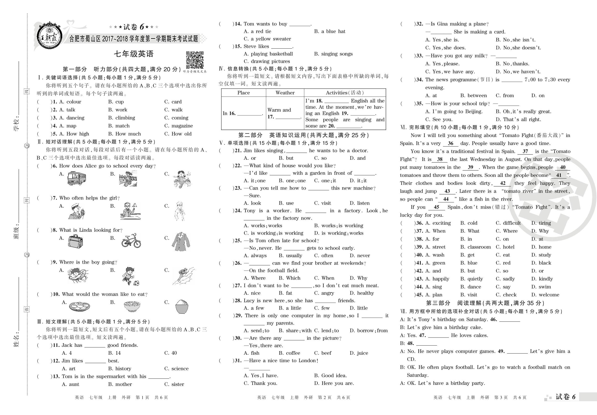 2017-2018学年第一学期合肥市蜀山区七年级英语试卷(外研版)_R211116143232806【6】