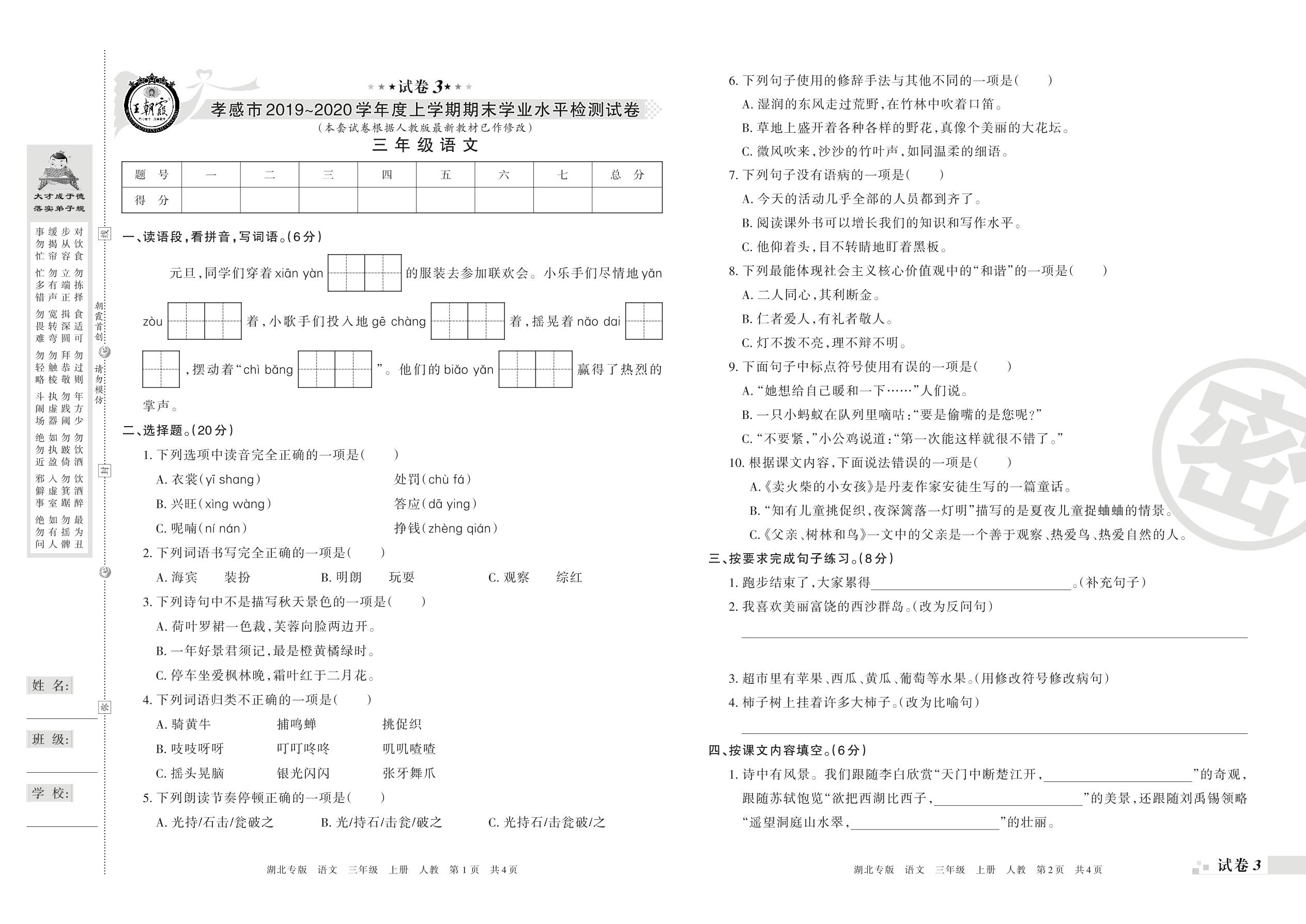 2019-2020学年第一学期孝感市三年级语文试卷(人教版)【3】