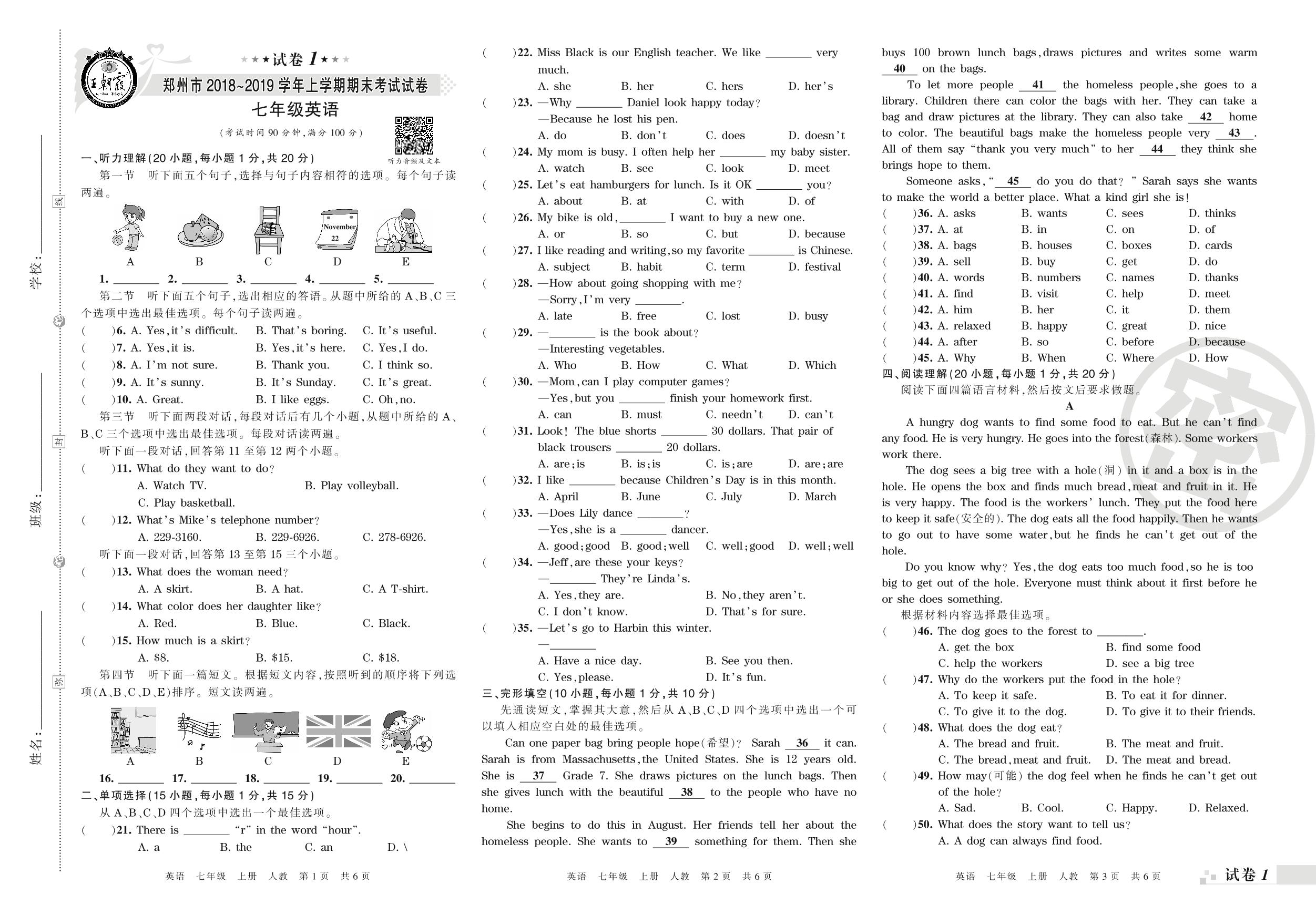 2018-2019学年第一学期郑州市七年级英语试卷(人教版)_R210807200104【1】