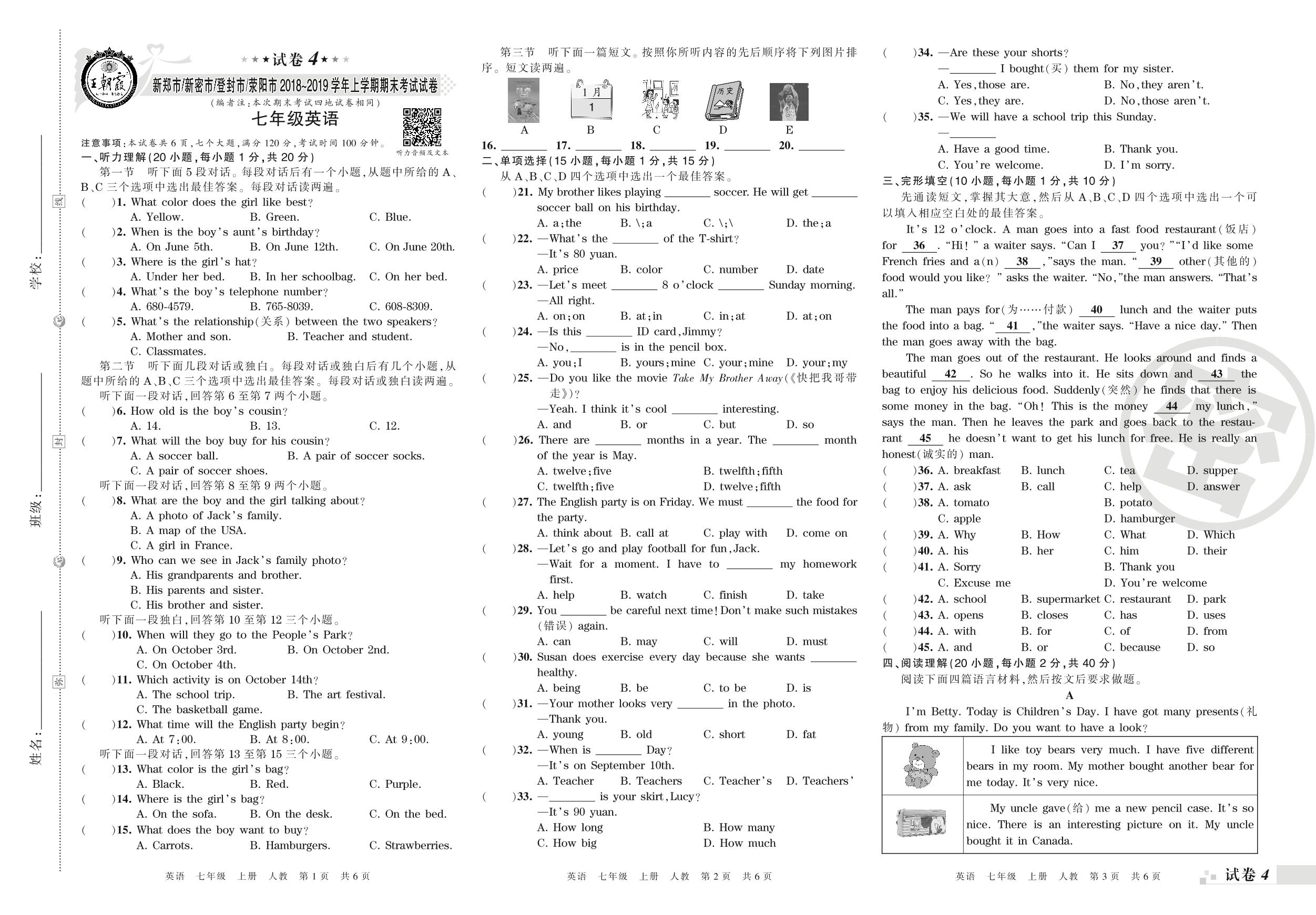 2018-2019学年第一学期新郑市、新密市、登封市、荥阳市七年级英语试卷(人教版)【4】