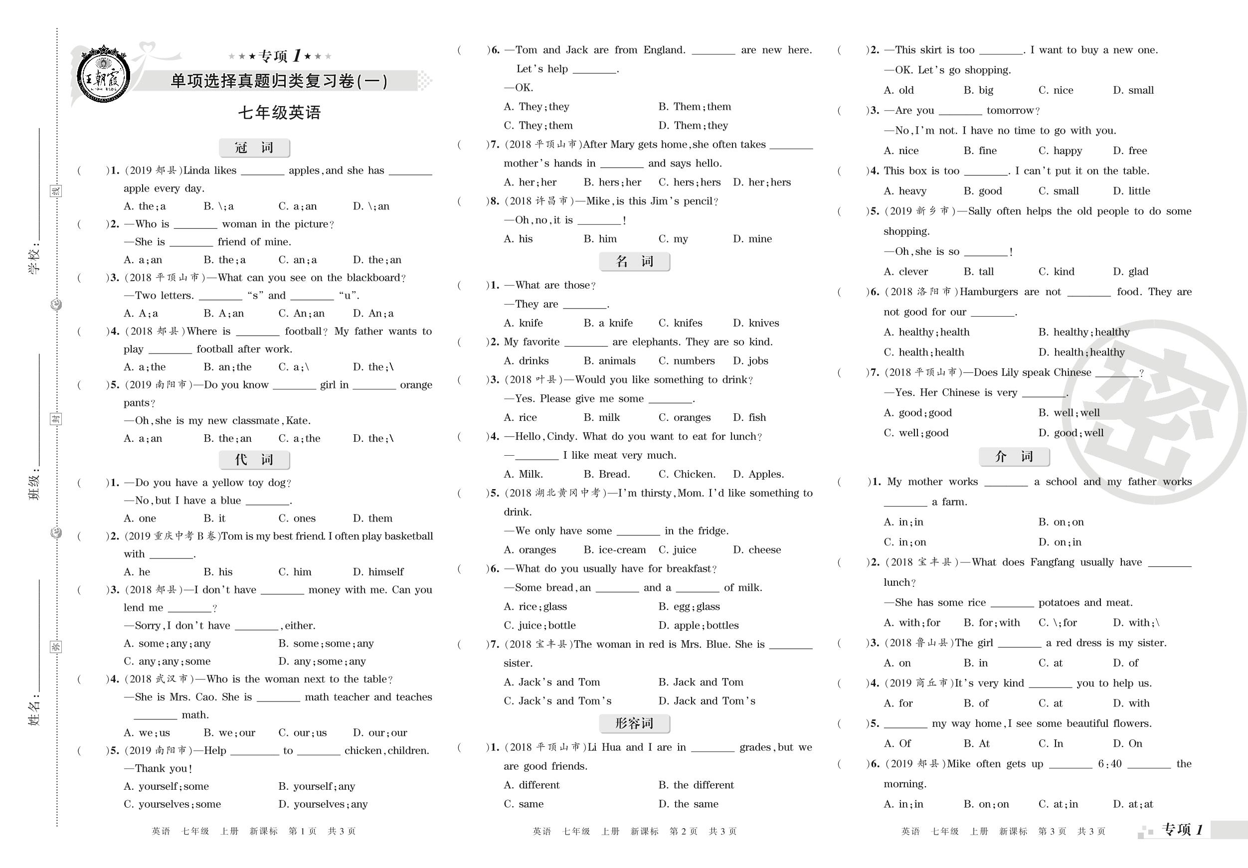 王朝霞期末专项卷——单项选择真题归类复习七年级上册英语(新课版)_R210807200200【0】