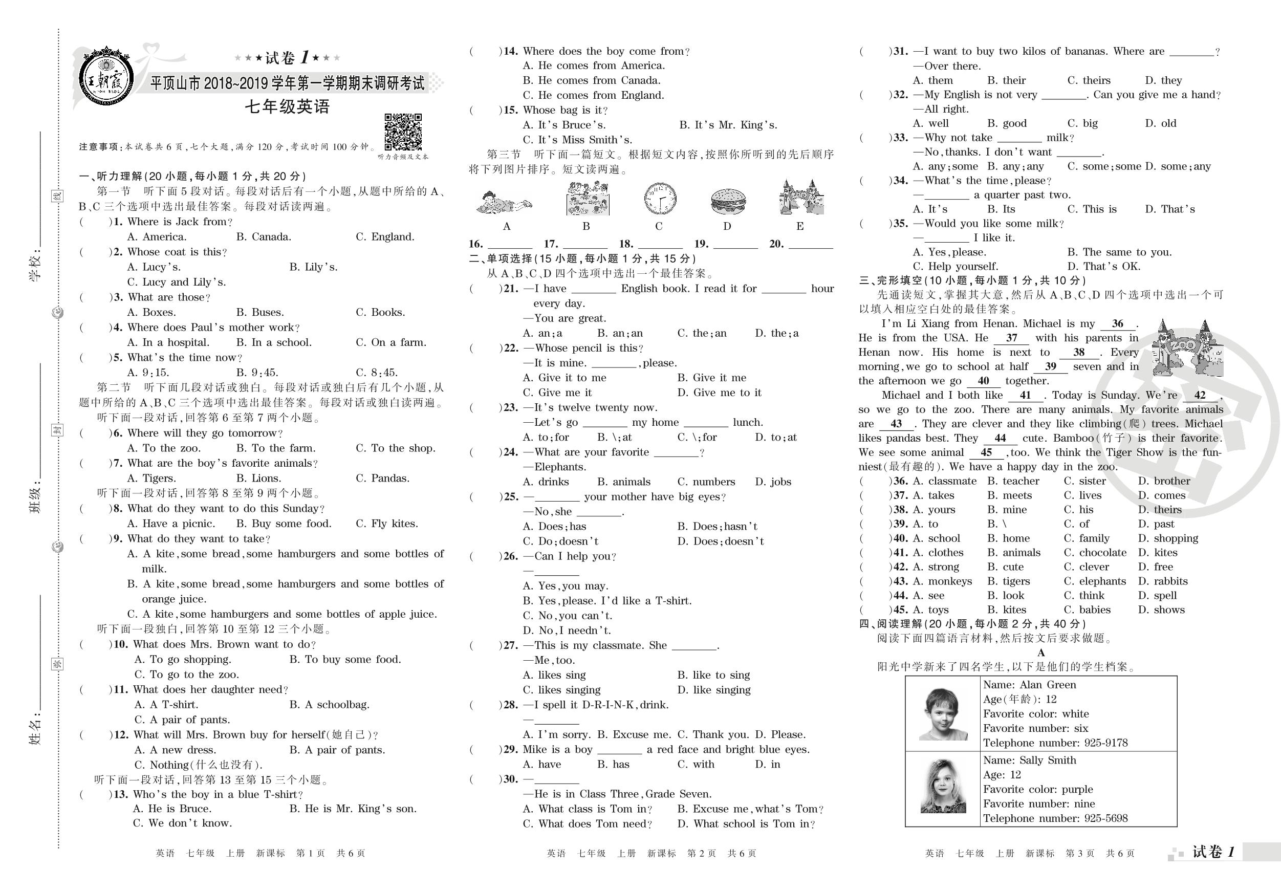 2018-2019学年第一学期平顶山市七年级英语试卷(新课版)【1】