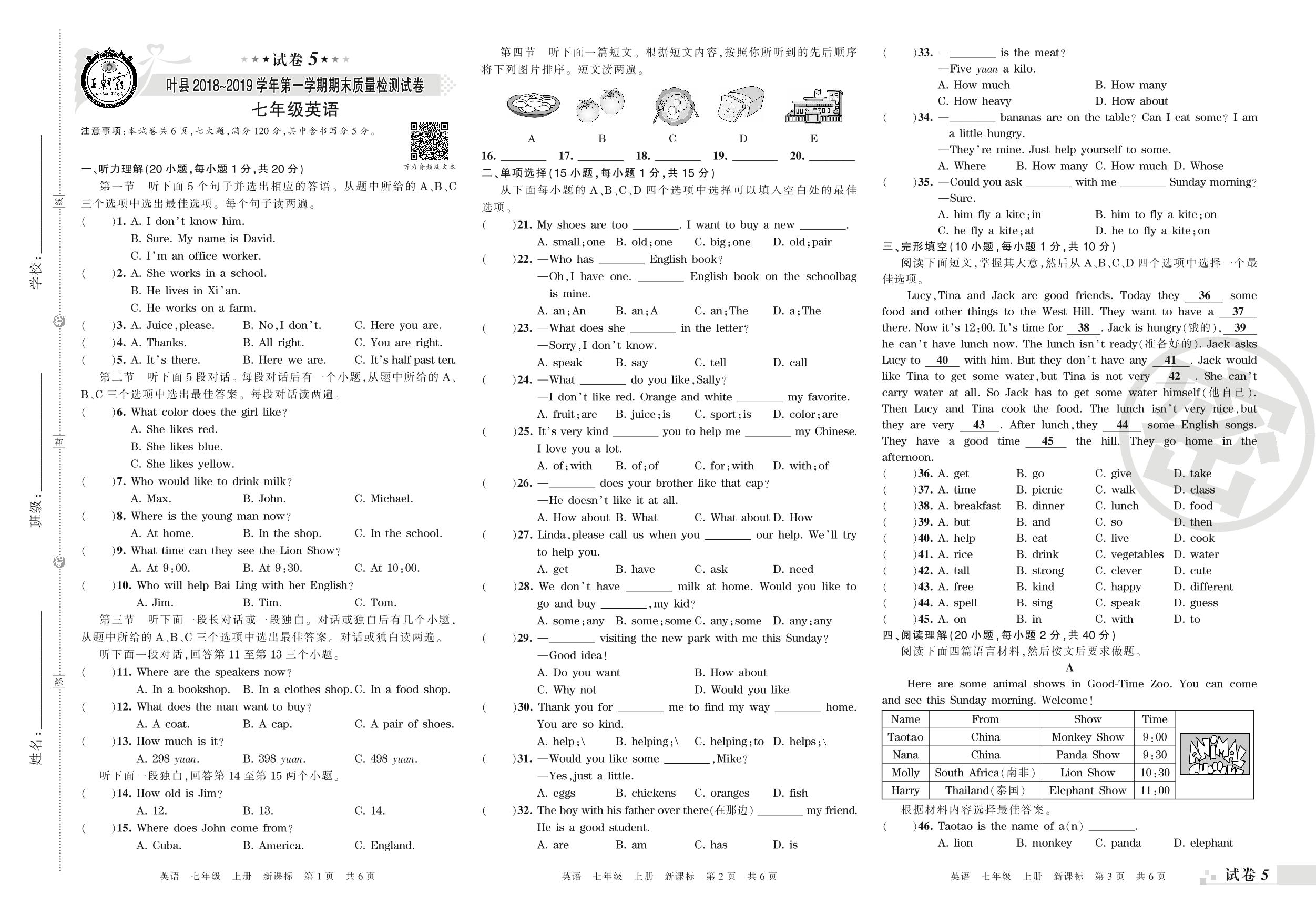 2018-2019学年第一学期平顶山市叶县七年级英语试卷(新课版)【5】
