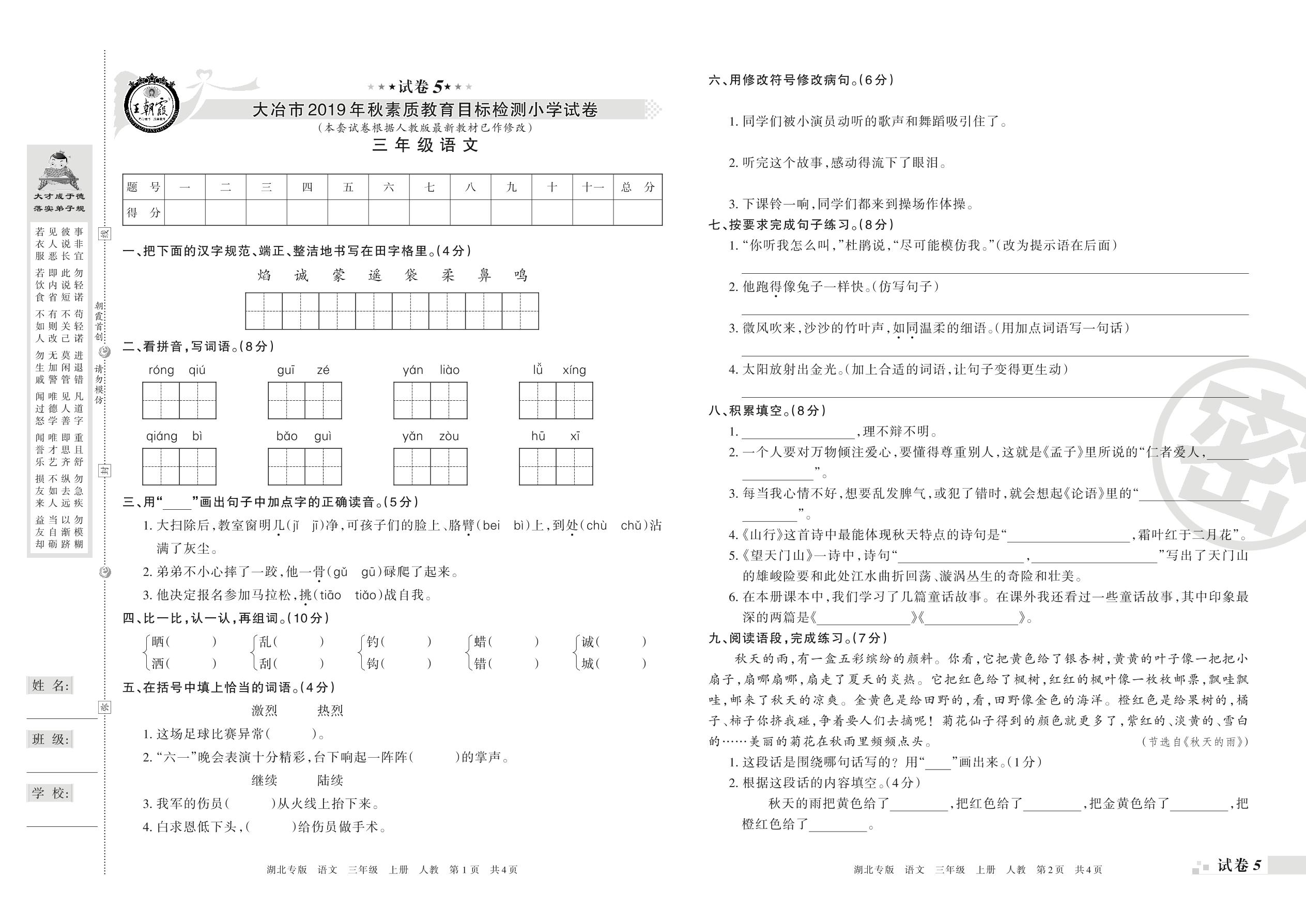 2019-2020学年第一学期大冶市三年级语文试卷(人教版)【5】