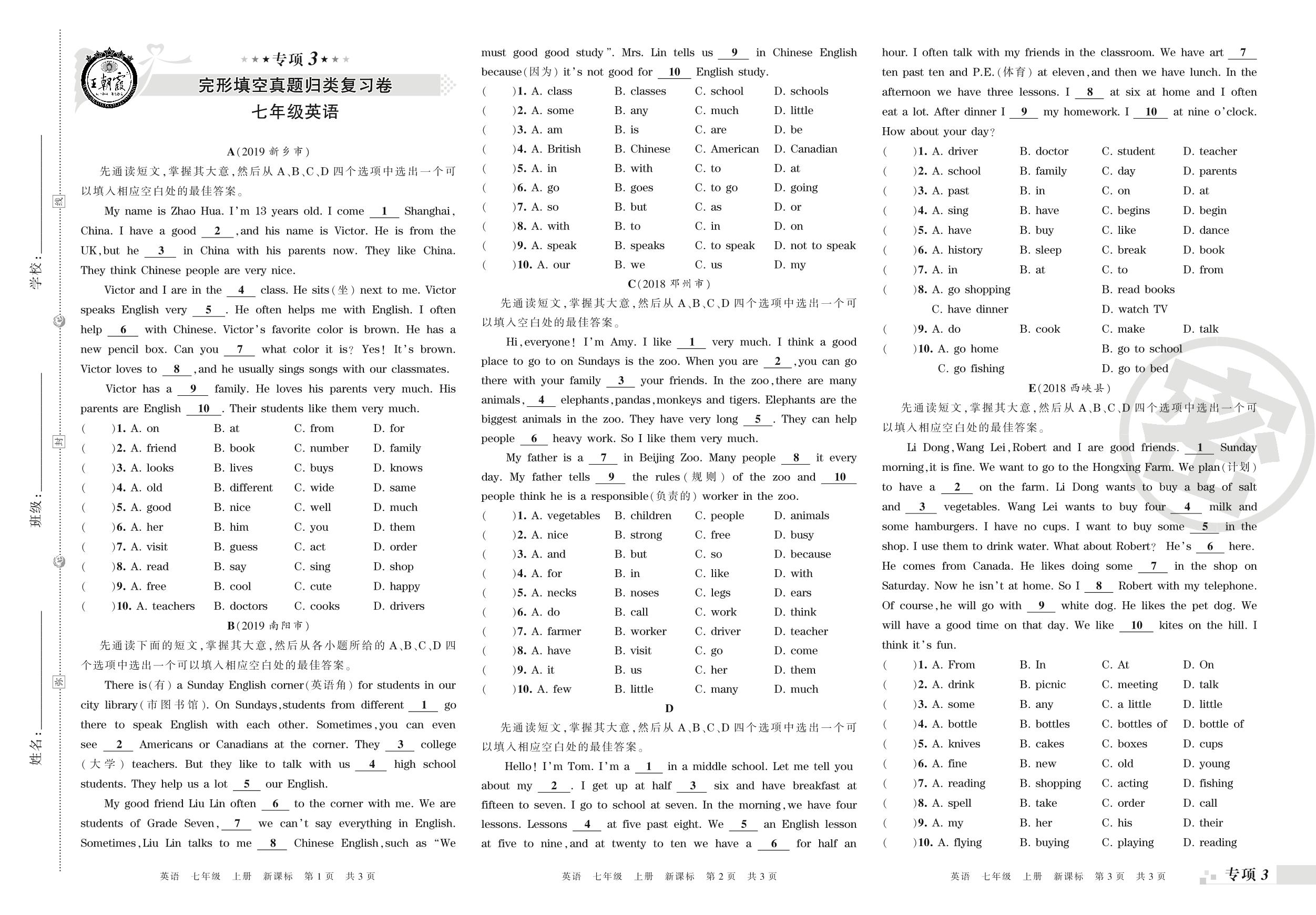 王朝霞期末专项卷——完形填空、选择型阅读真题归类复习七年级上册英语(新课版)_R210807200317【0】