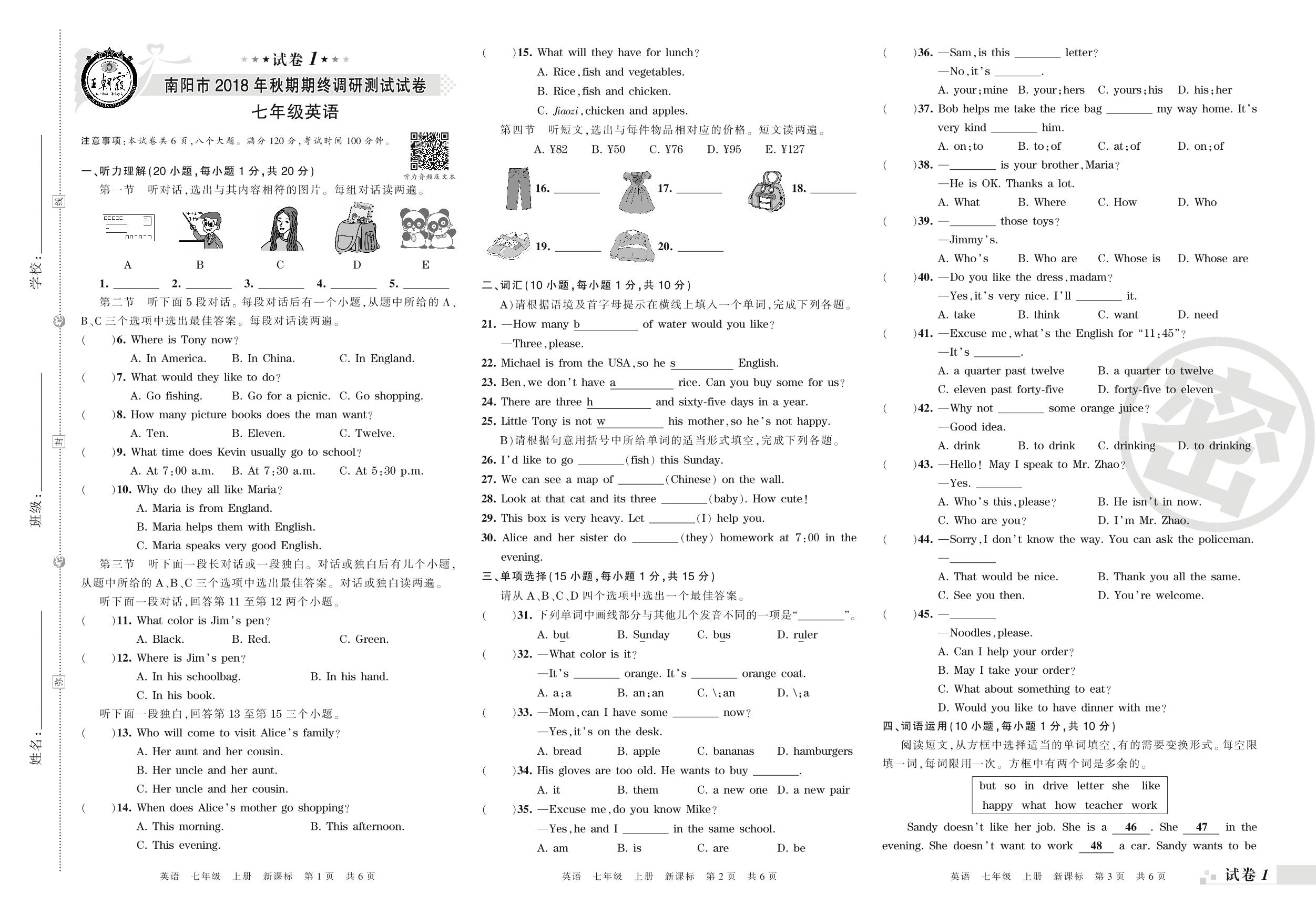 2018-2019学年第一学期南阳市七年级英语试卷(新课版)_R210807200331【1】