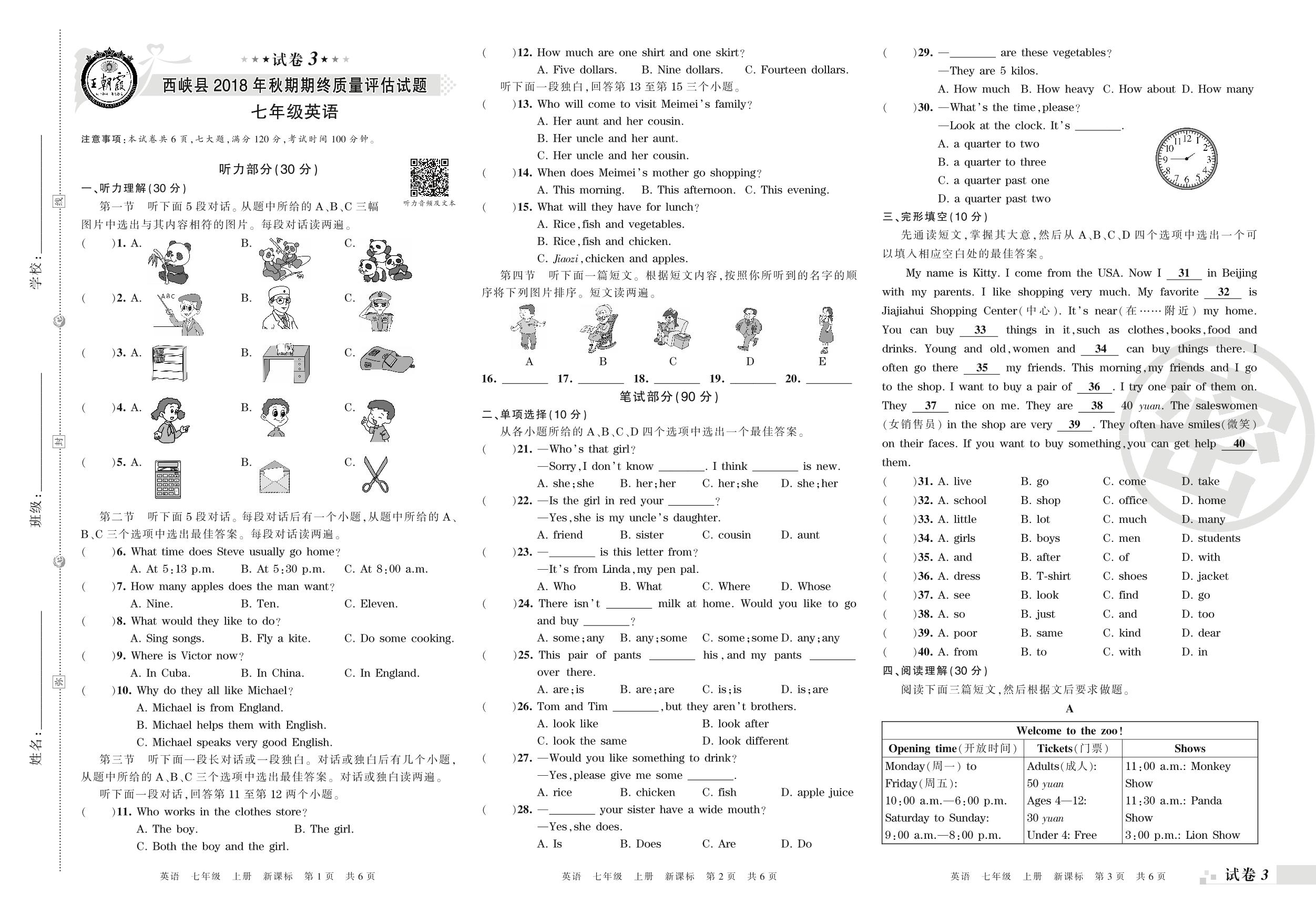 2018-2019学年第一学期南阳市西峡县七年级英语试卷(新课版)【3】