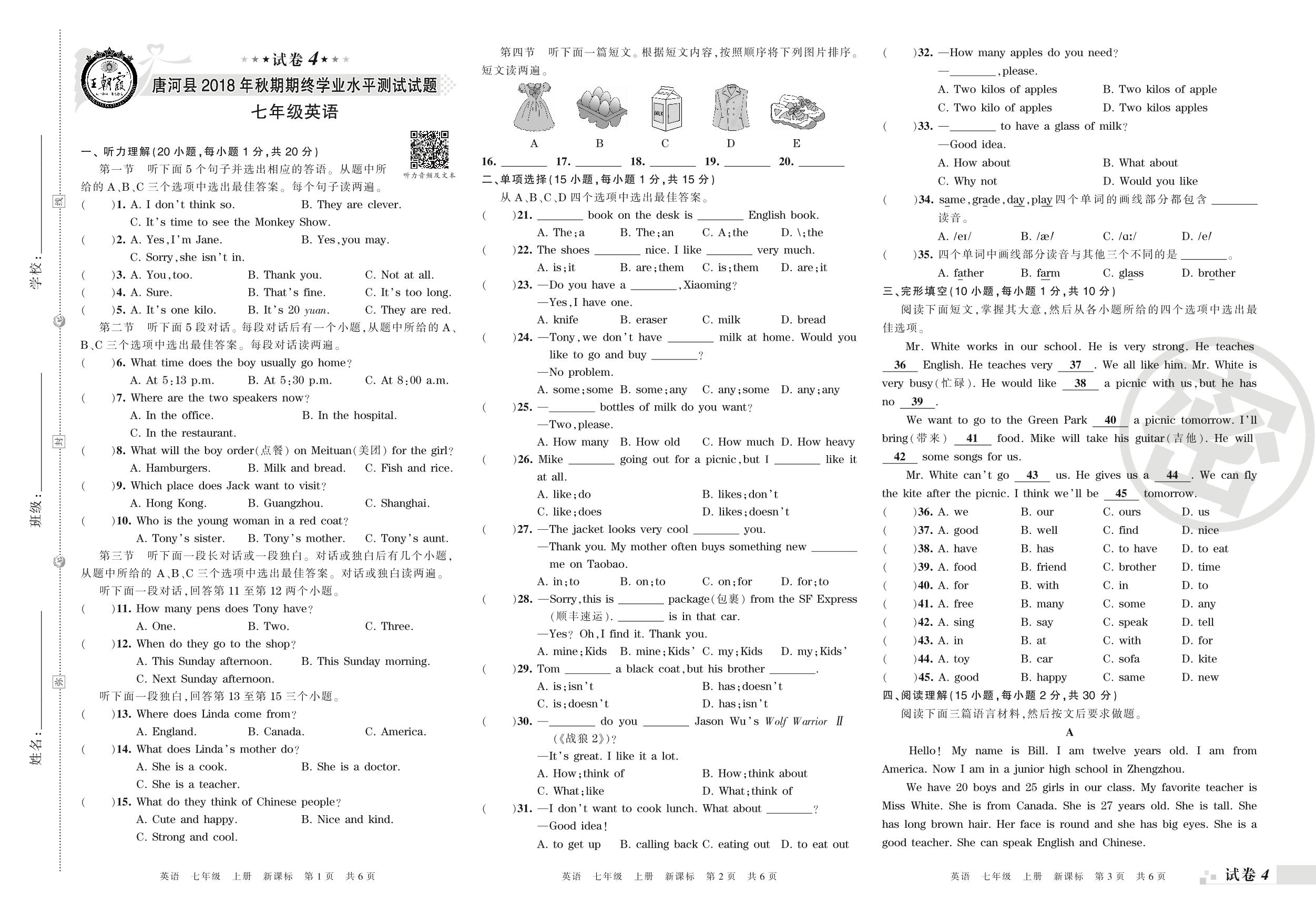 2018-2019学年第一学期南阳市唐河县七年级英语试卷(新课版)【4】