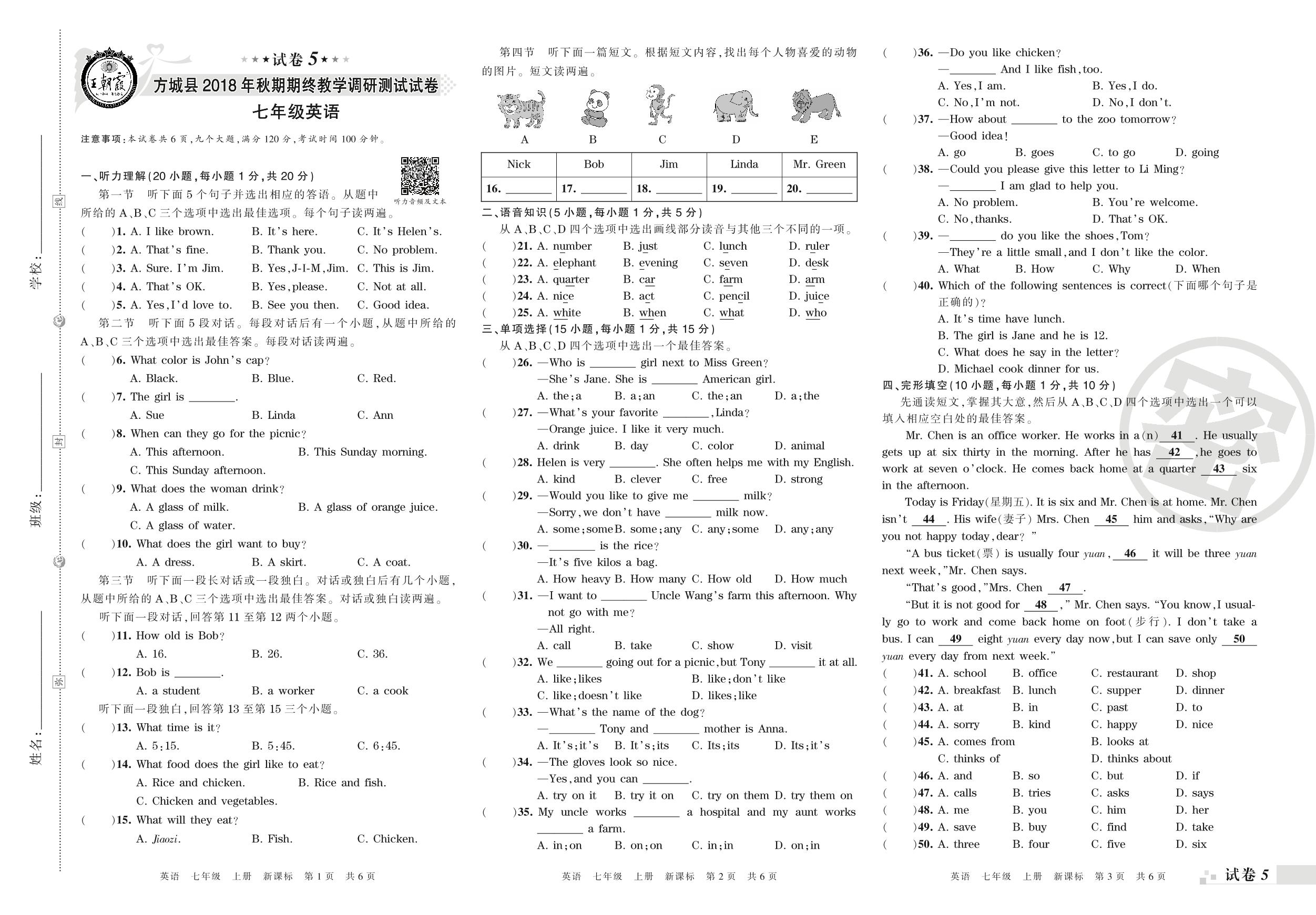 2018-2019学年第一学期南阳市方城县七年级英语试卷(新课版)【5】