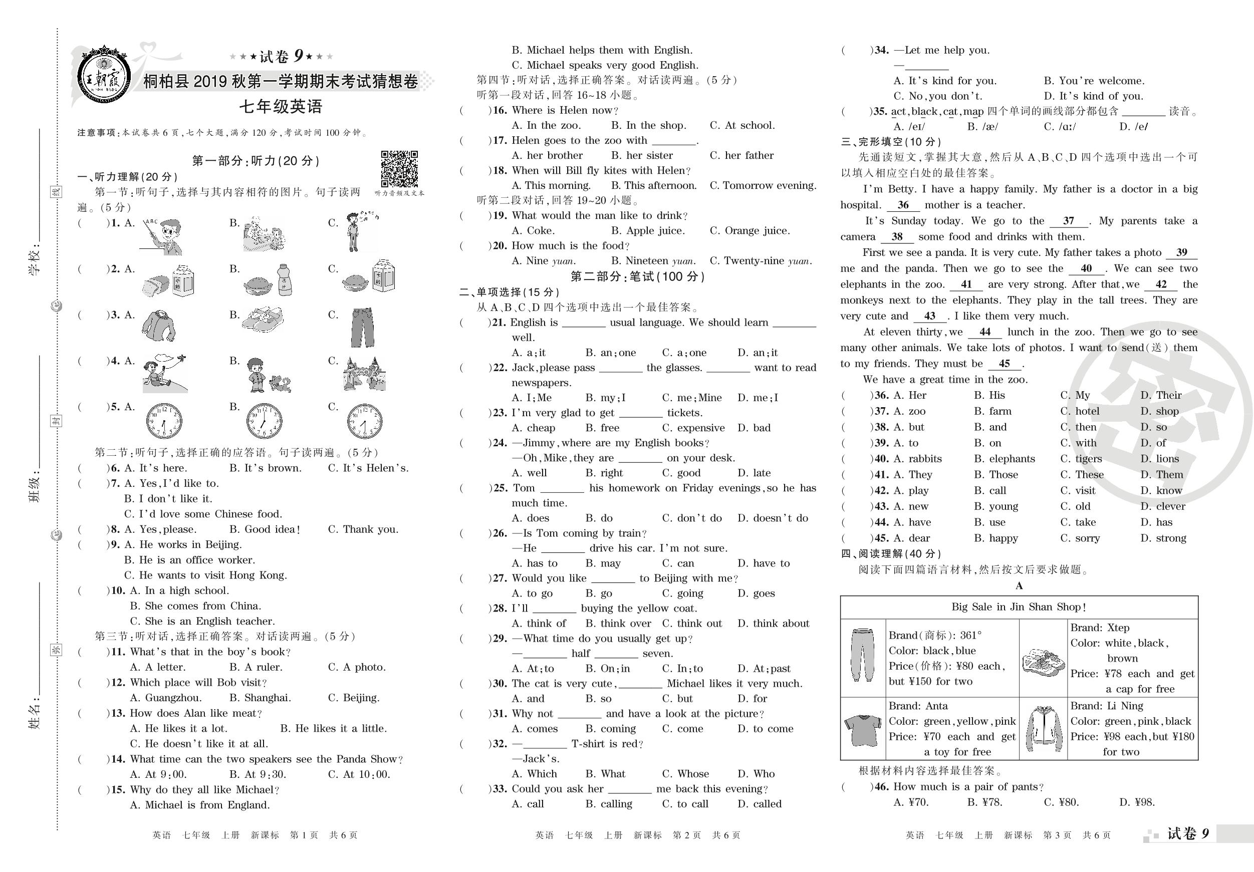 2018-2019学年第一学期南阳市桐柏县猜想卷七年级英语试卷(新课版)【9】