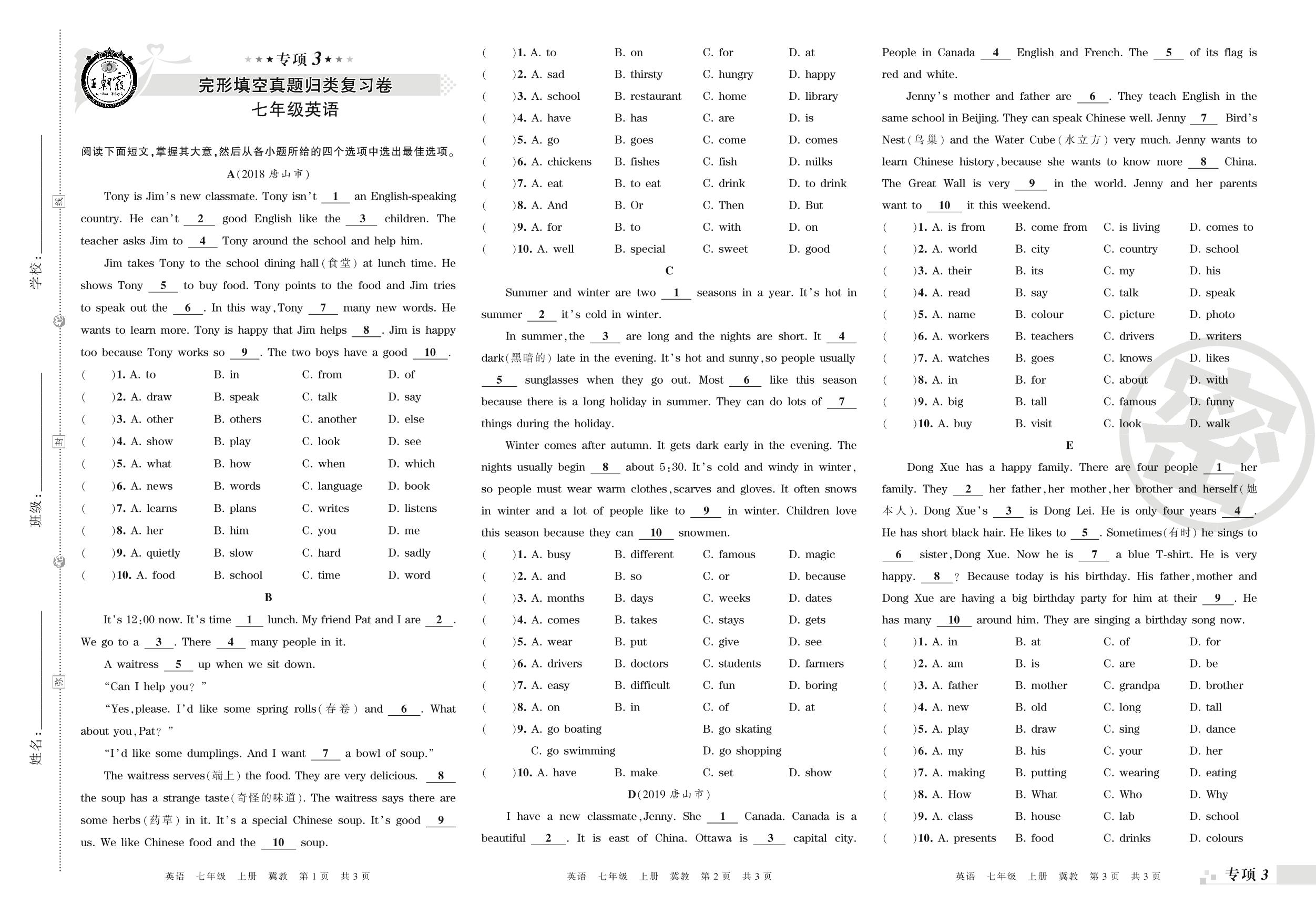 王朝霞期末专项卷——完形填空、阅读理解真题归类复习七年级上册英语(冀教版)_R210807200437【0】