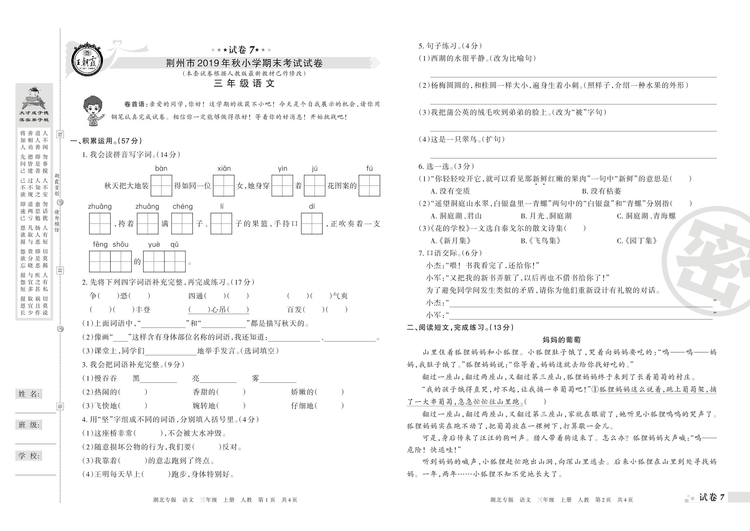 2019-2020学年第一学期荆州市三年级语文试卷(人教版)【7】