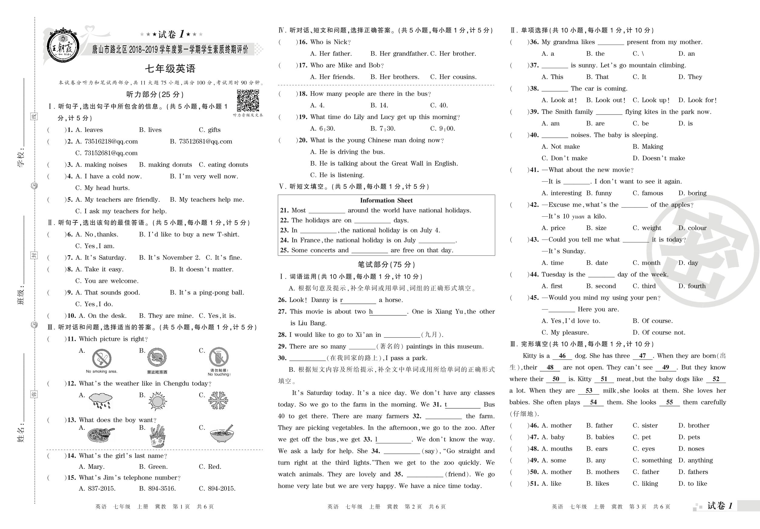 2018-2019学年第一学期唐山市路北区七年级英语试卷(冀教版)【1】