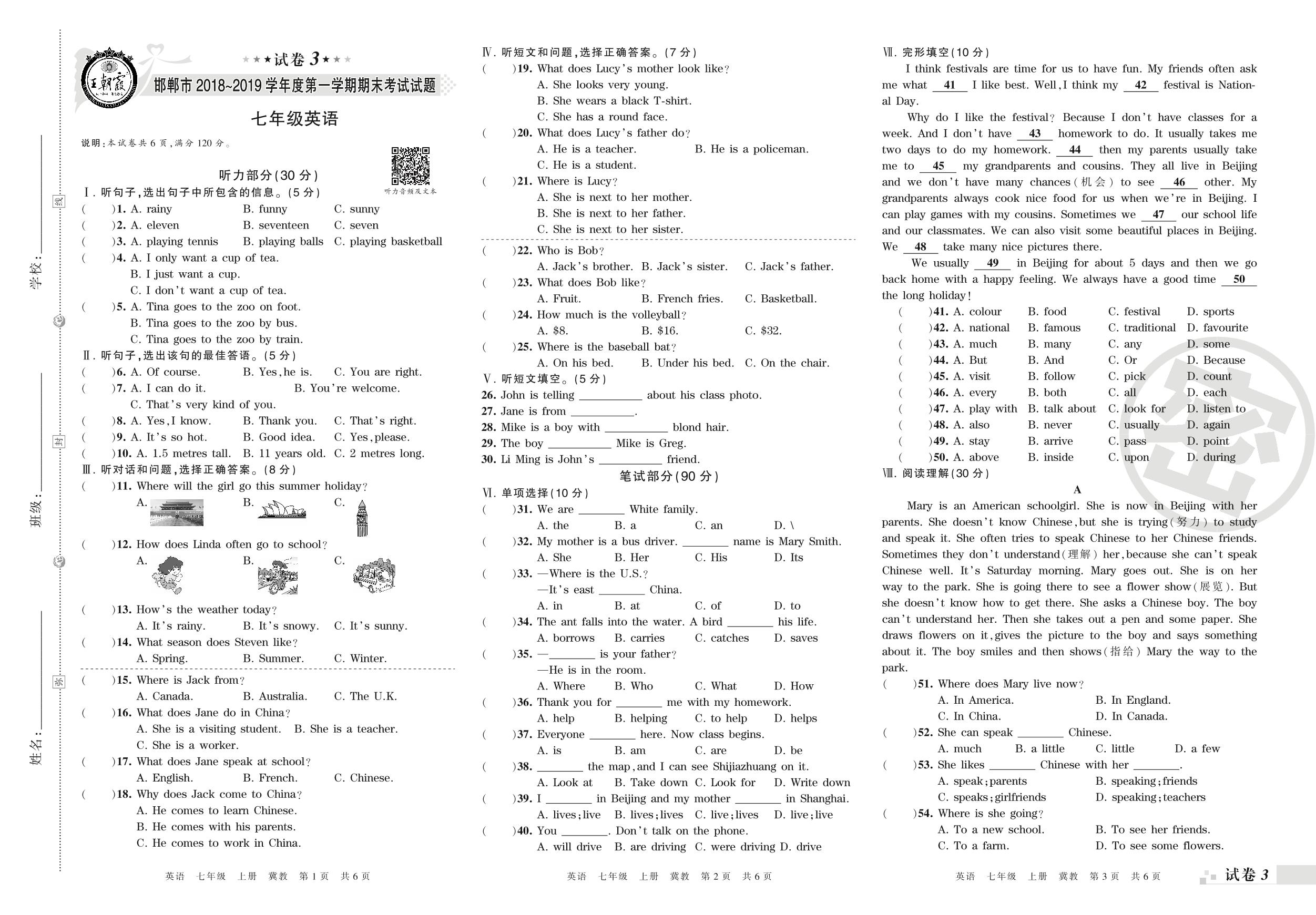 2018-2019学年第一学期邯郸市七年级英语试卷(冀教版)【3】