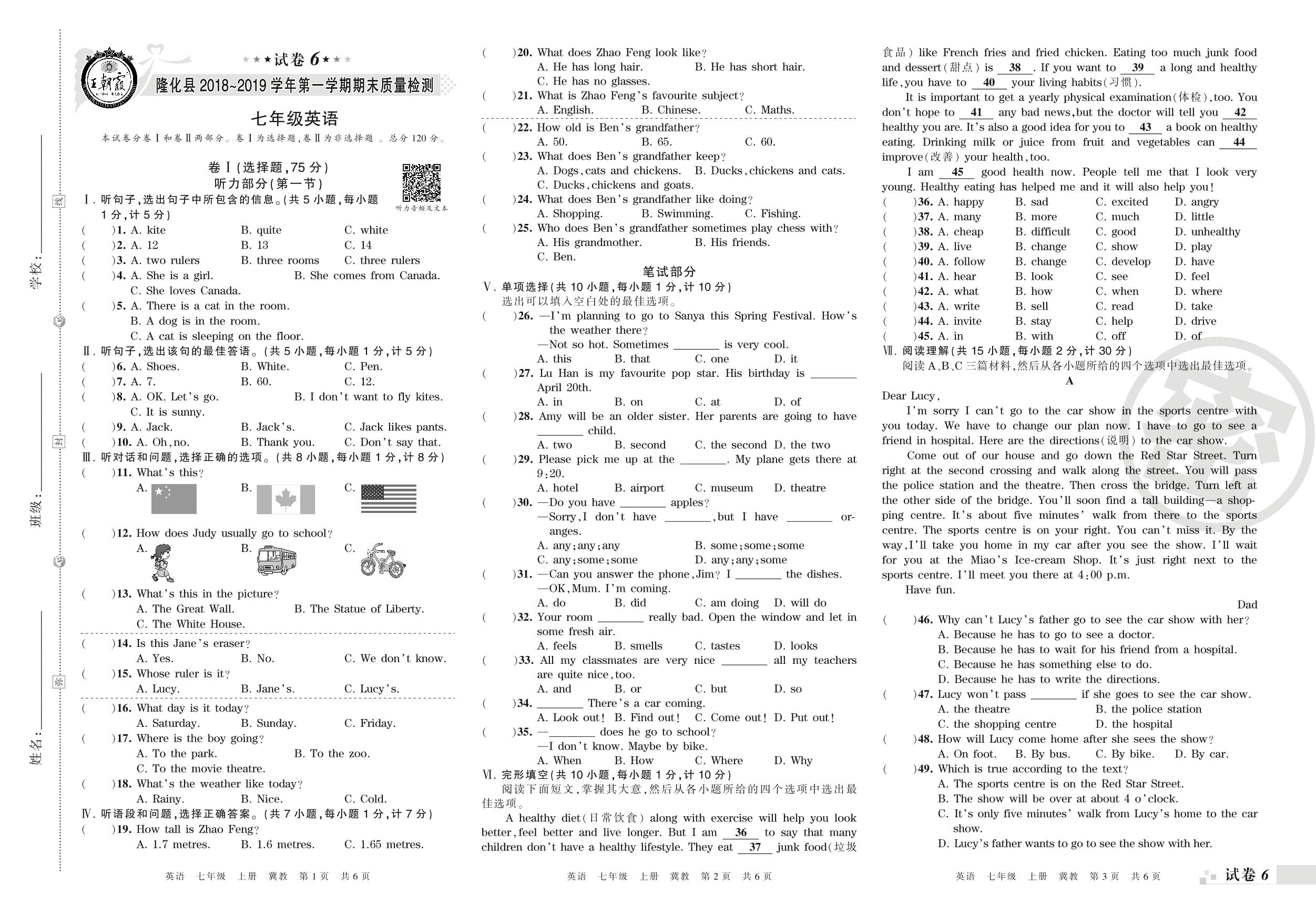 七年级英语冀教版上册期末卷