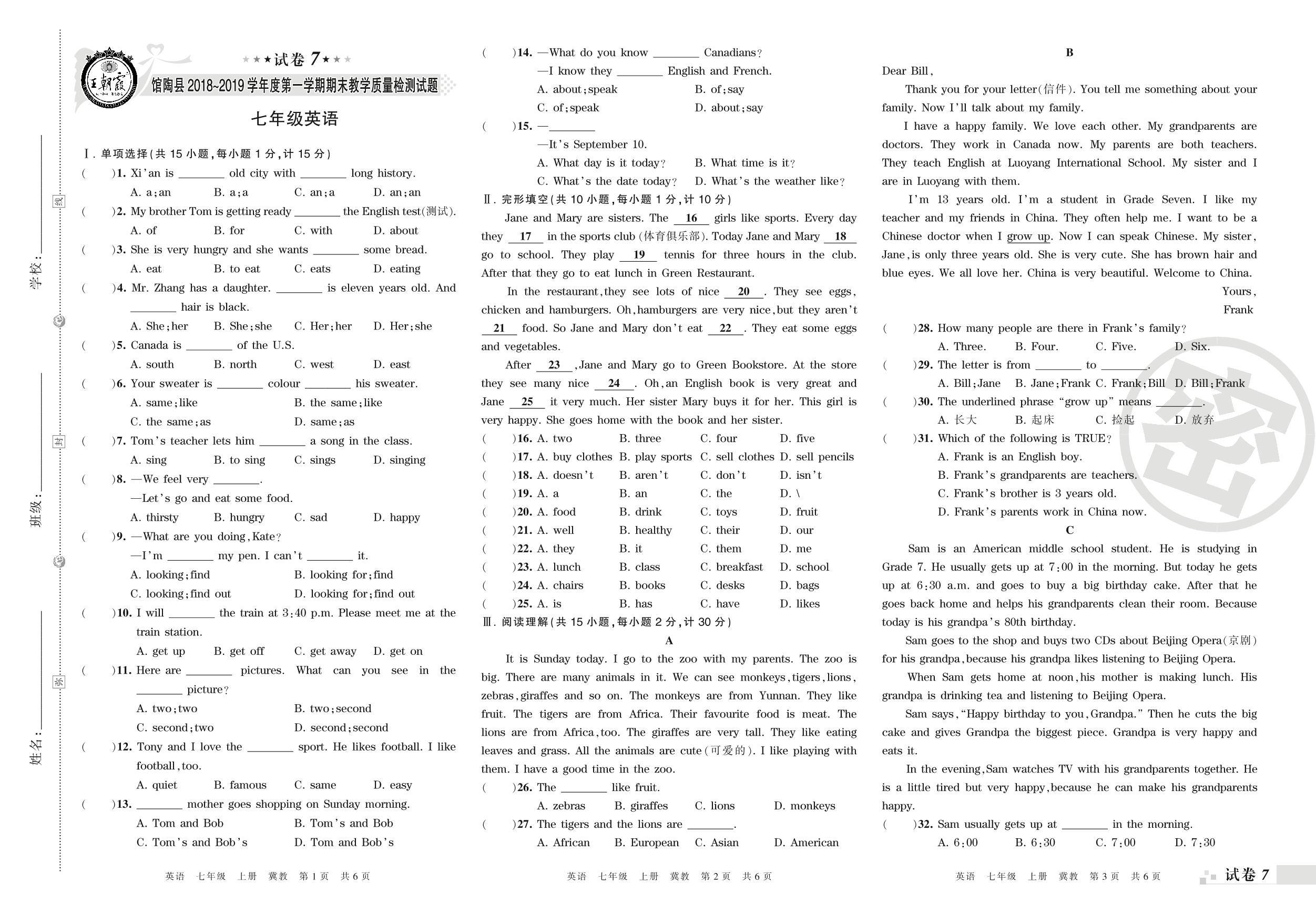 2018-2019学年第一学期邯郸市馆陶县七年级英语试卷(冀教版)【7】