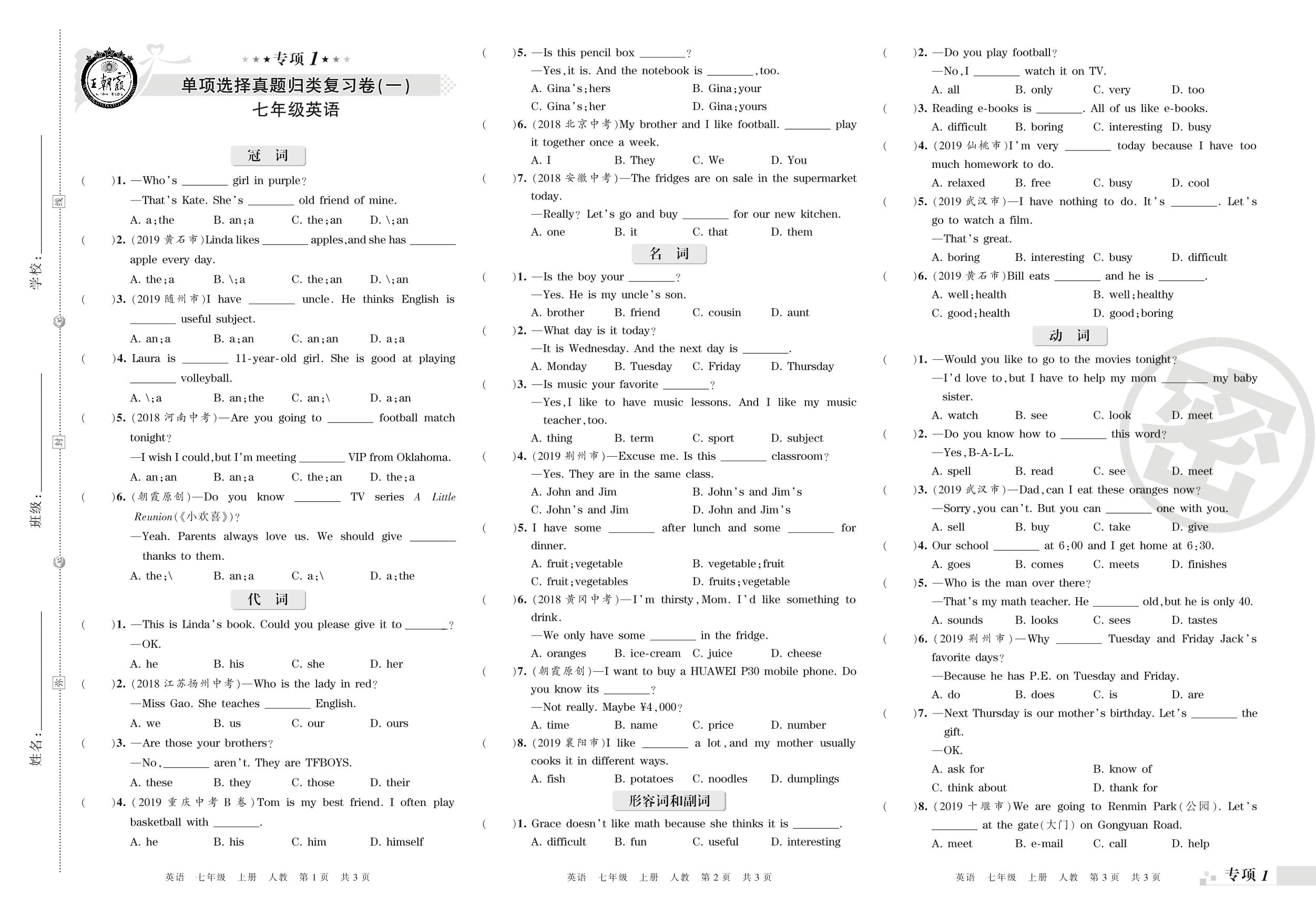 王朝霞期末专项卷——单项选择真题归类复习七年级上册英语(人教版)_R210807200602【0】