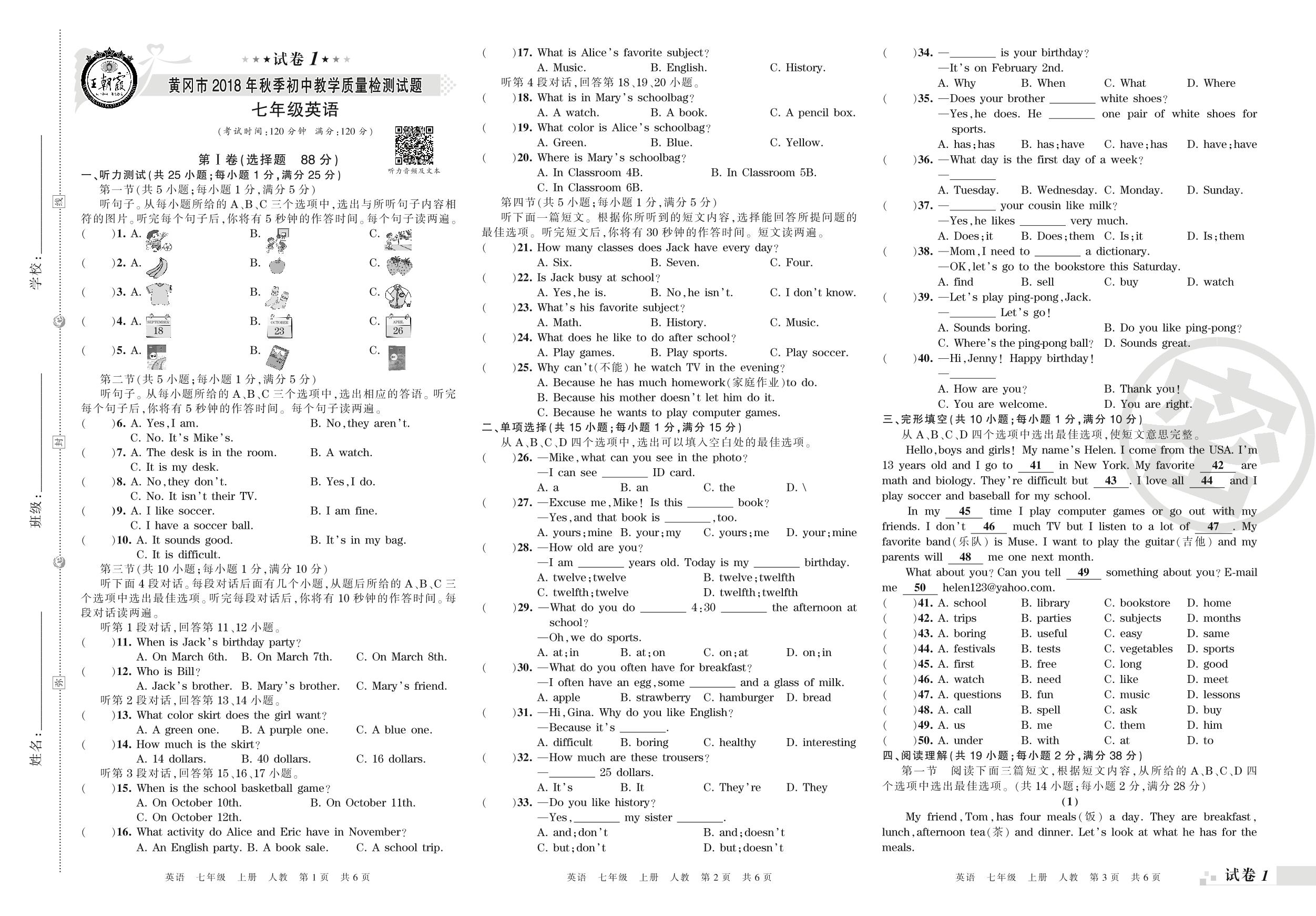 2018-2019学年第一学期黄冈市七年级英语试卷(人教版)【1】