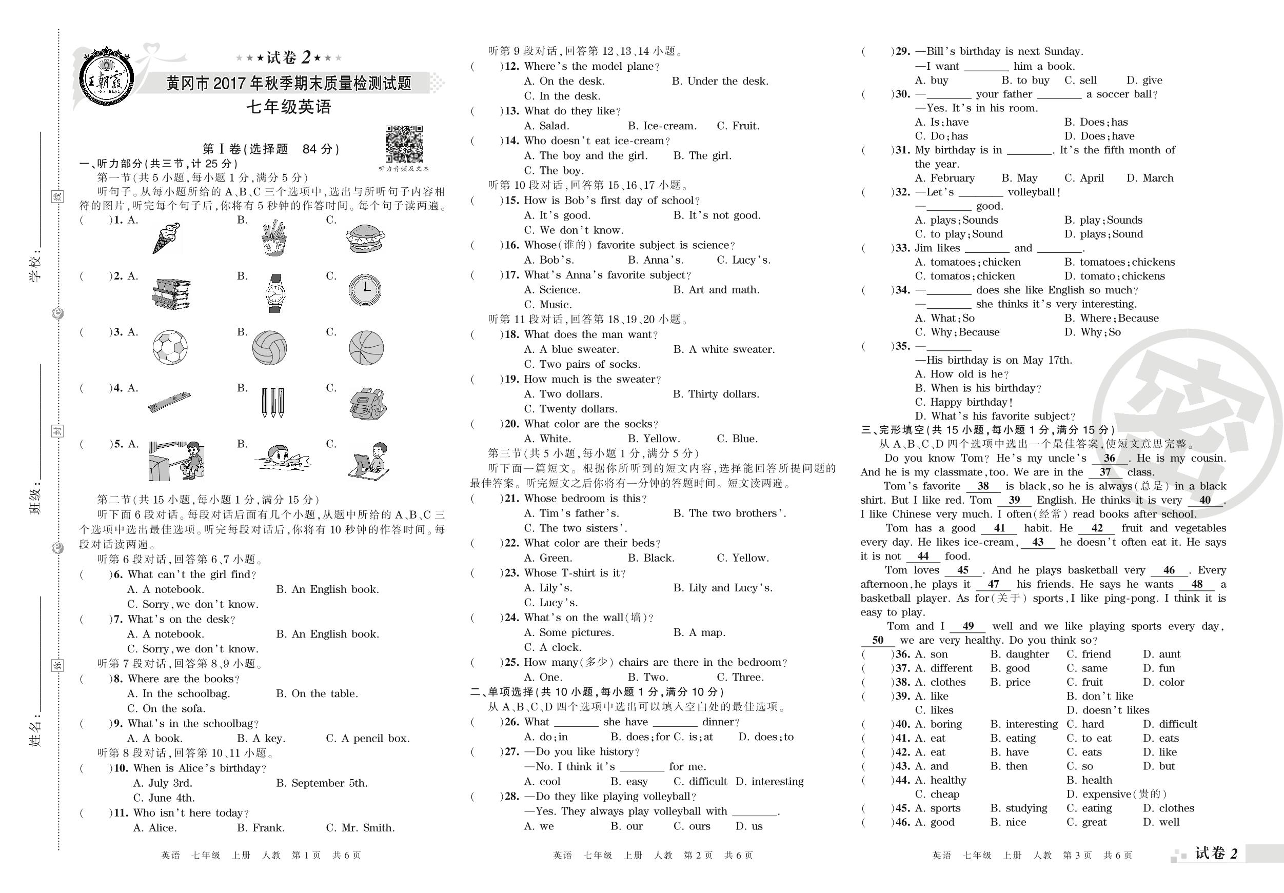 2017-2018学年第一学期黄冈市七年级英语试卷(人教版)【2】