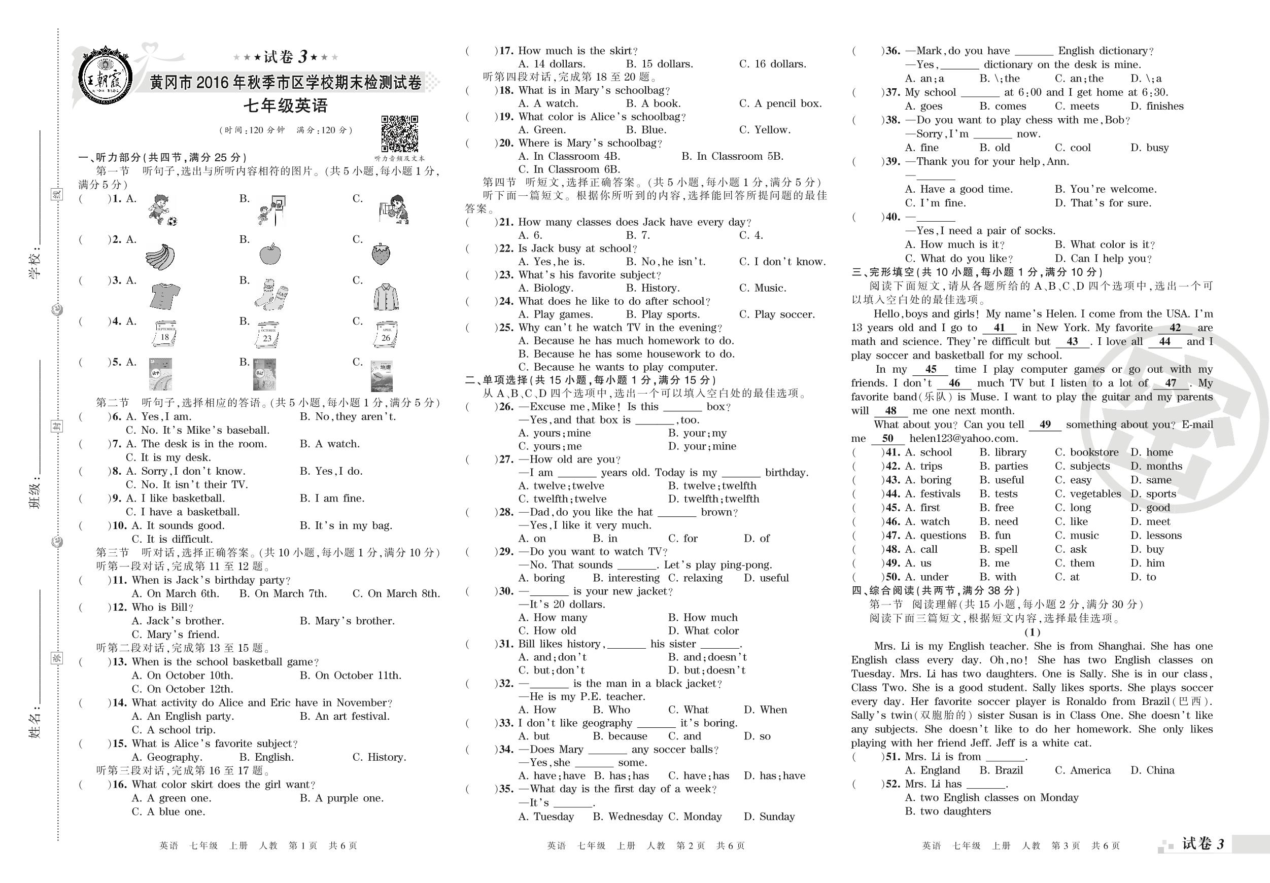 2016-2017学年第一学期黄冈市七年级英语试卷(人教版)【3】