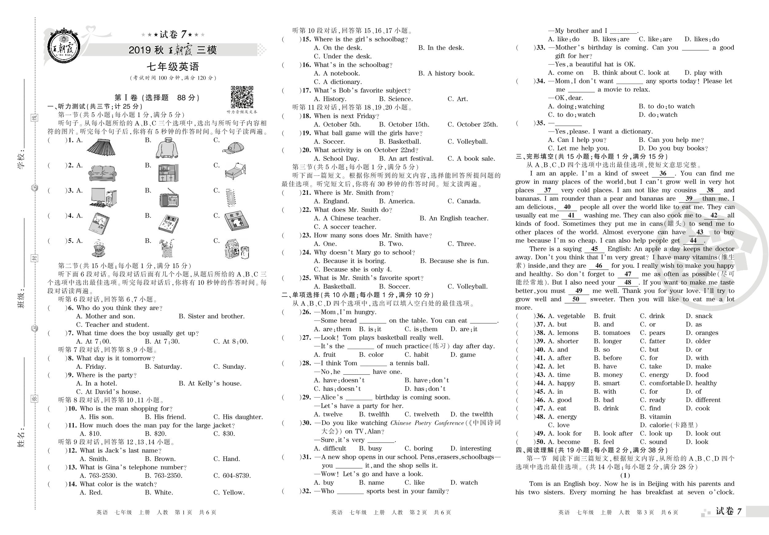 王朝霞期末模拟卷七年级上册英语(人教版)_R210807200701【7】