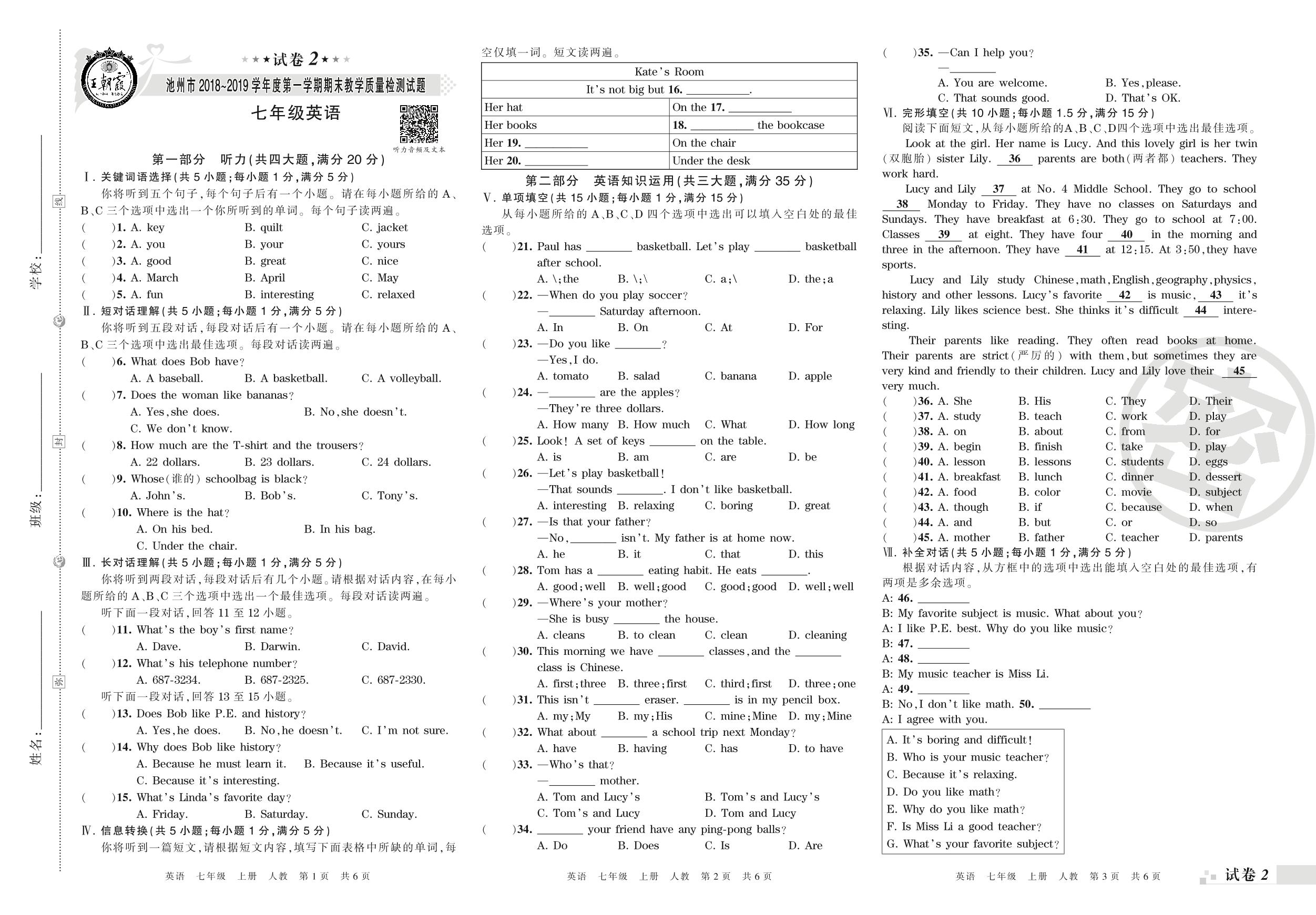 2018-2019学年第一学期池州市七年级英语试卷(人教版)【2】