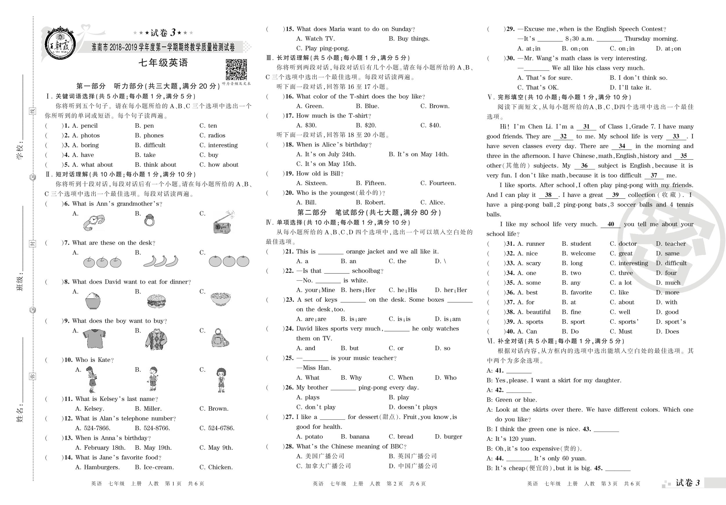 2018-2019学年第一学期淮南市七年级英语试卷(人教版)【3】