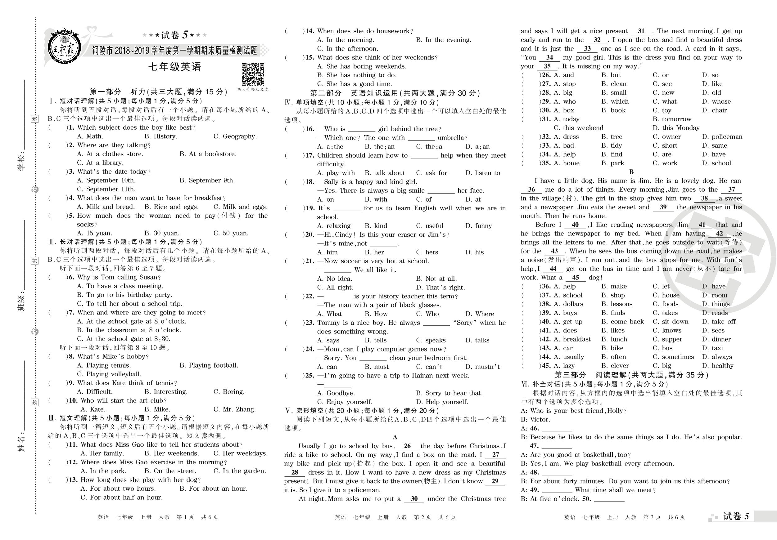 2018-2019学年第一学期铜陵市七年级英语试卷(人教版)【5】