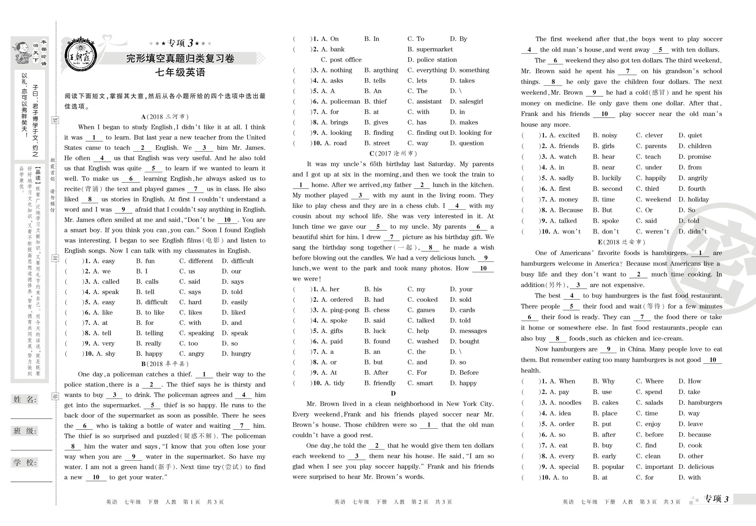 王朝霞期末专项卷——完形填空、阅读理解真题归类复习卷七年级下册英语(人教版)_R210807200826【0】