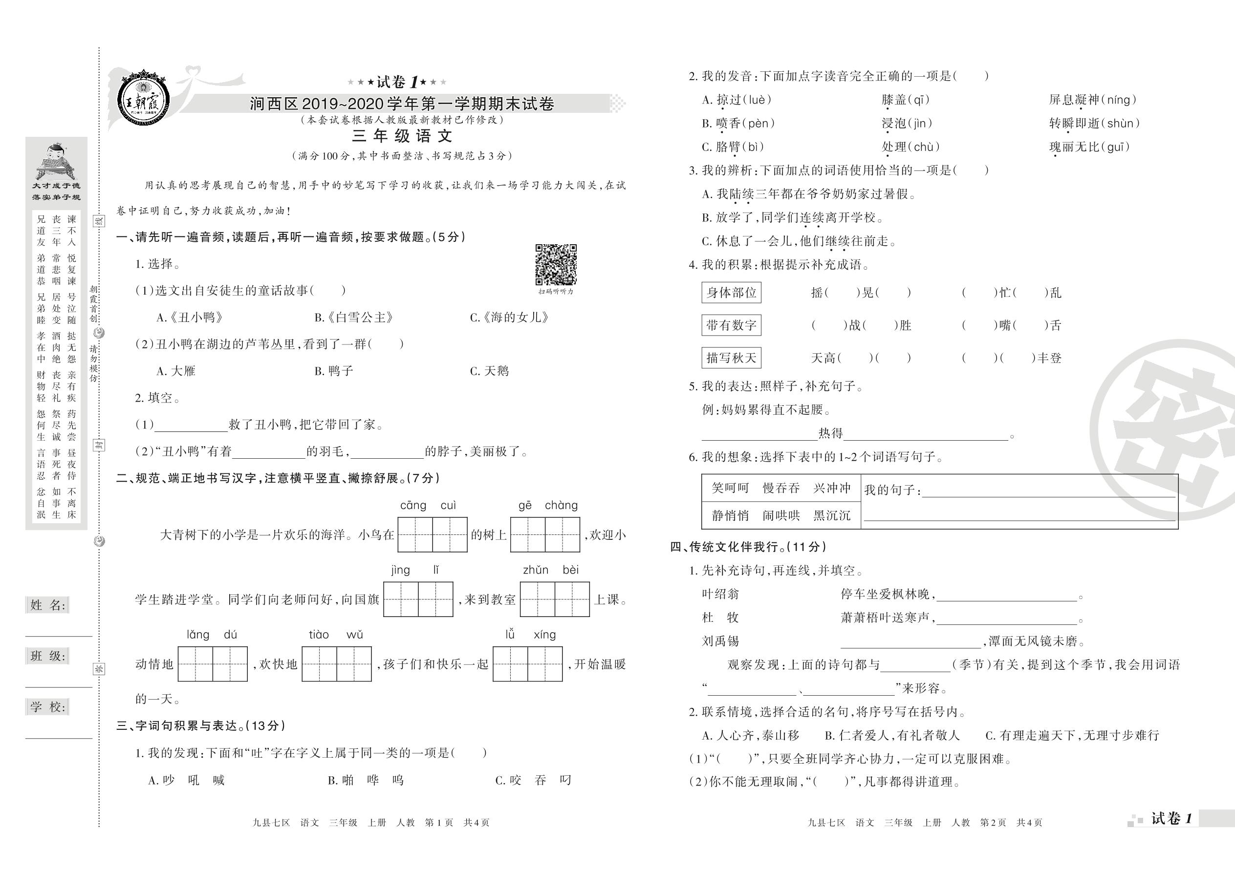 2019-2020学年第一学期洛阳市涧西区三年级语文试卷(人教版)【1】