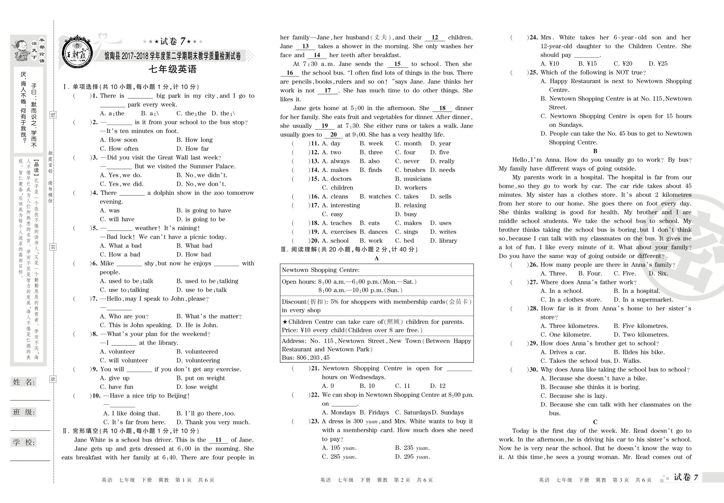 七年级英语冀教版下册期末卷
