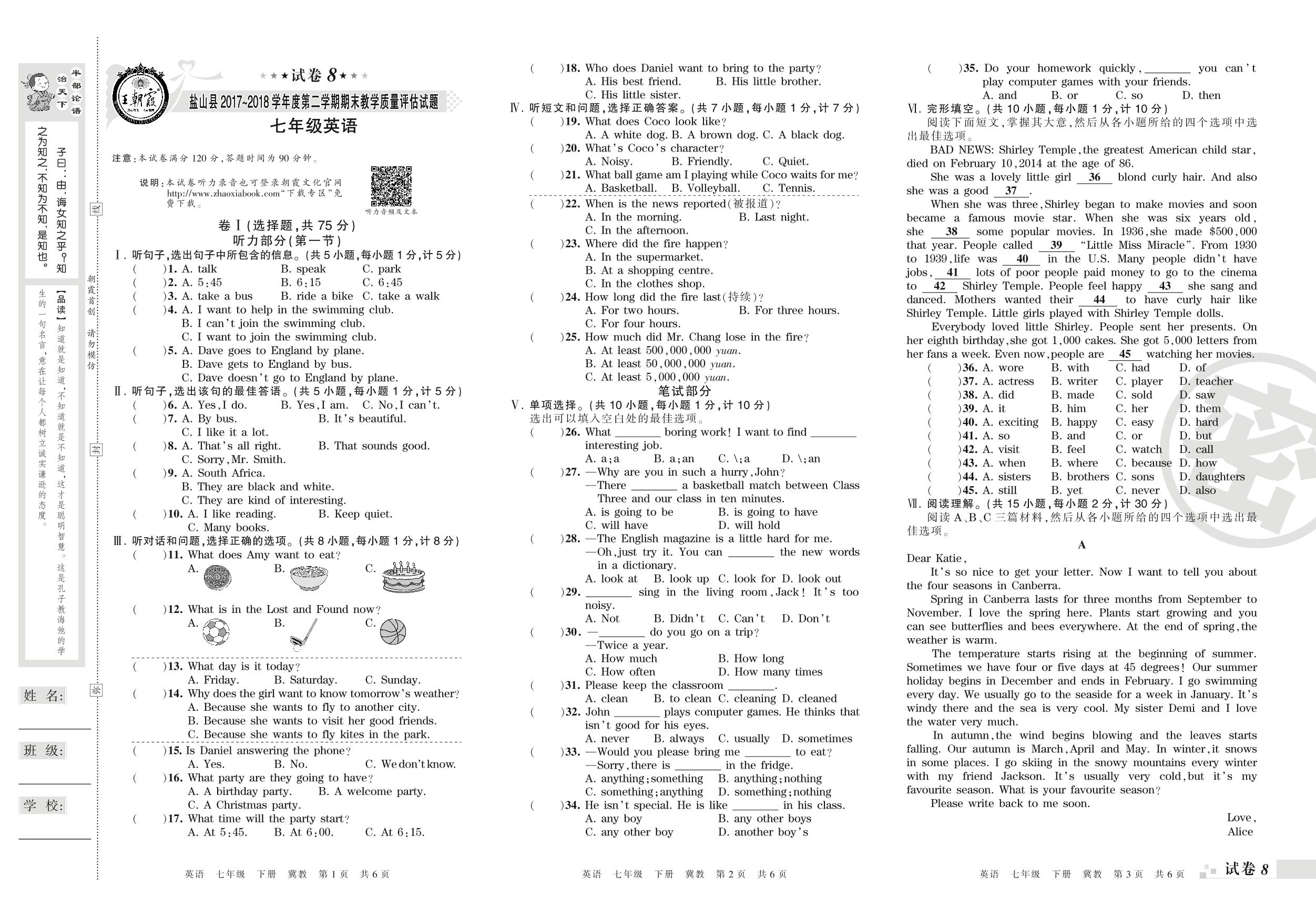 2017-2018学年第二学期沧州市盐山县七年级英语试卷(冀教版)【8】