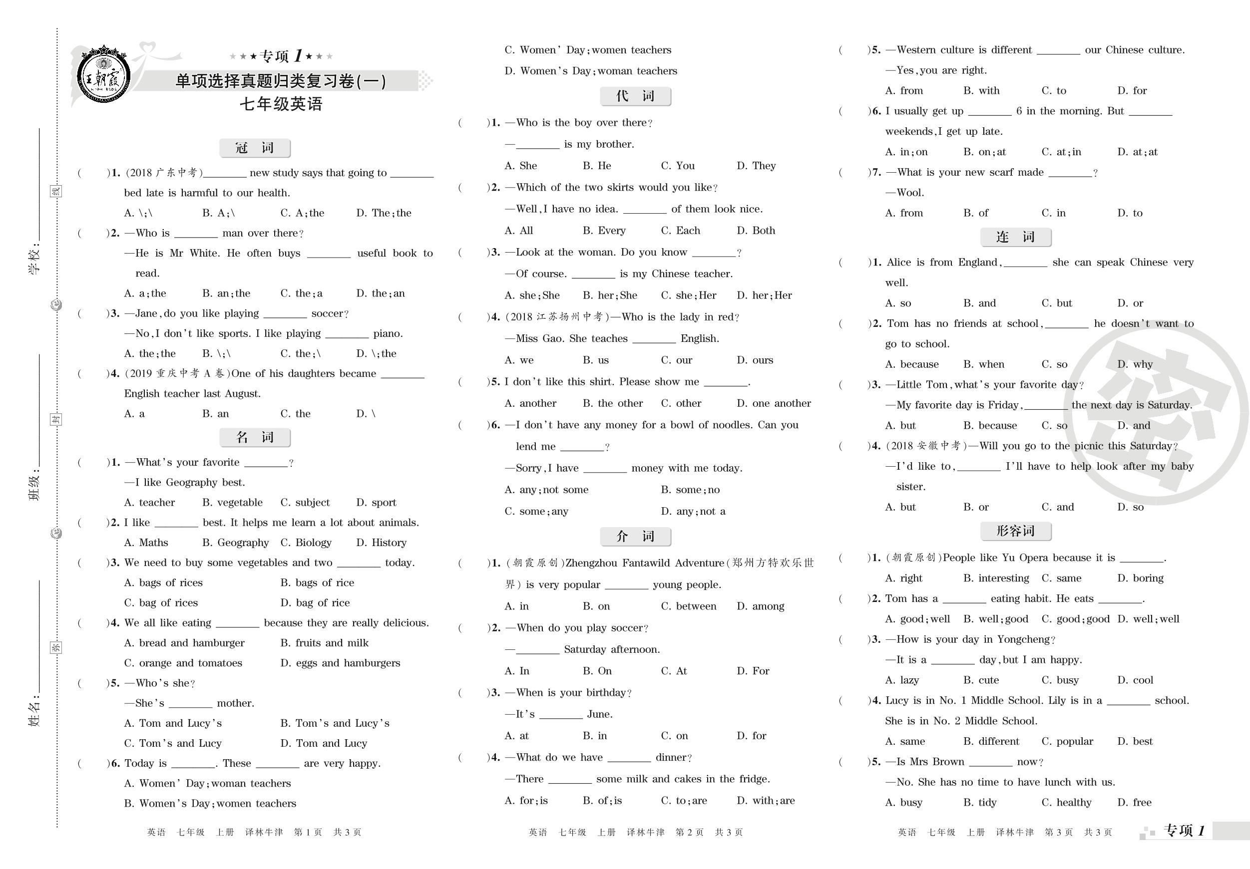 王朝霞期末专项卷——单项选择真题归类复习七年级上册英语(译林版)_R210807201240【0】