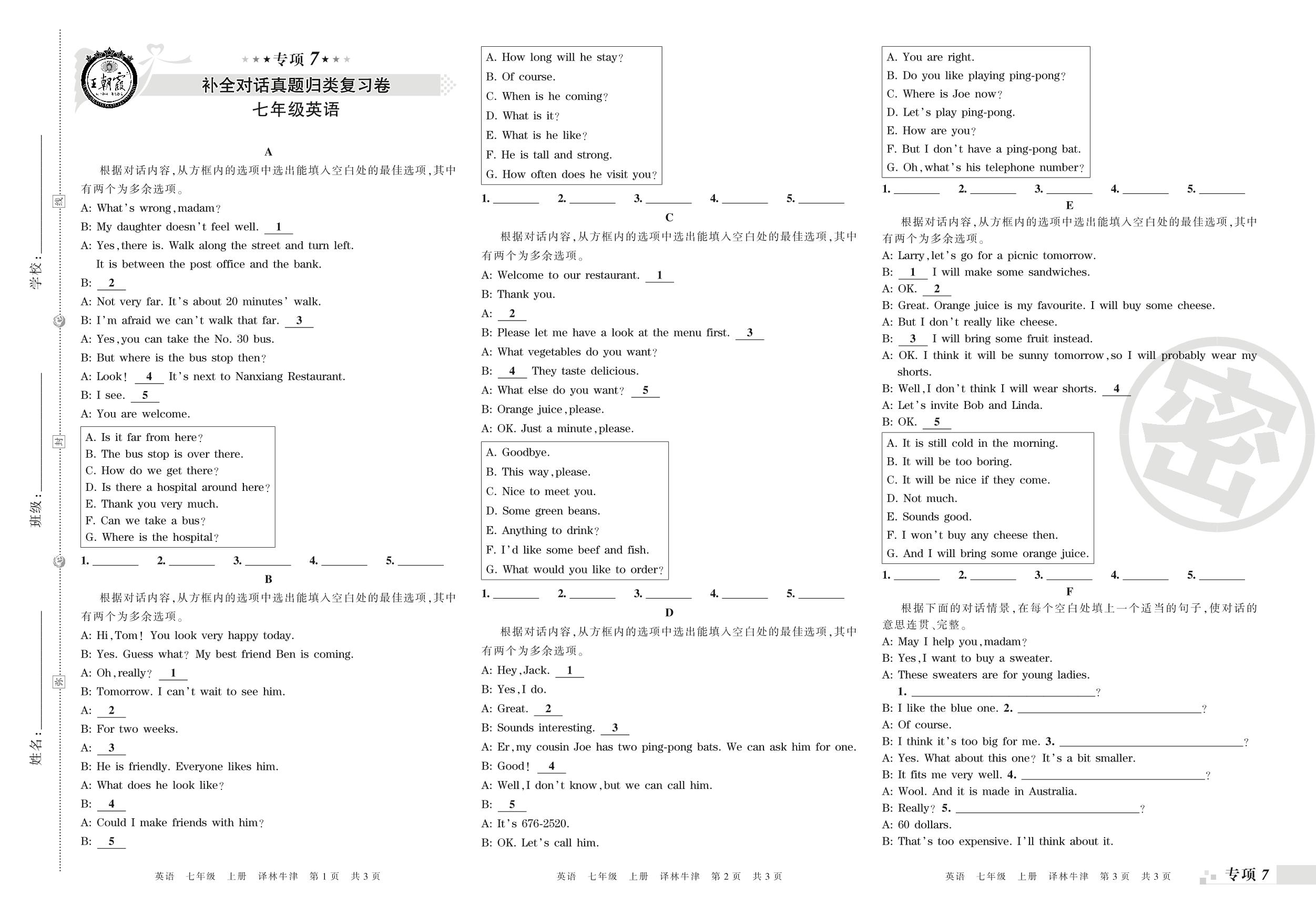 王朝霞期末专项卷——补全对话、书面表达真题归类复习七年级上册英语(译林版)_R210807201257【0】