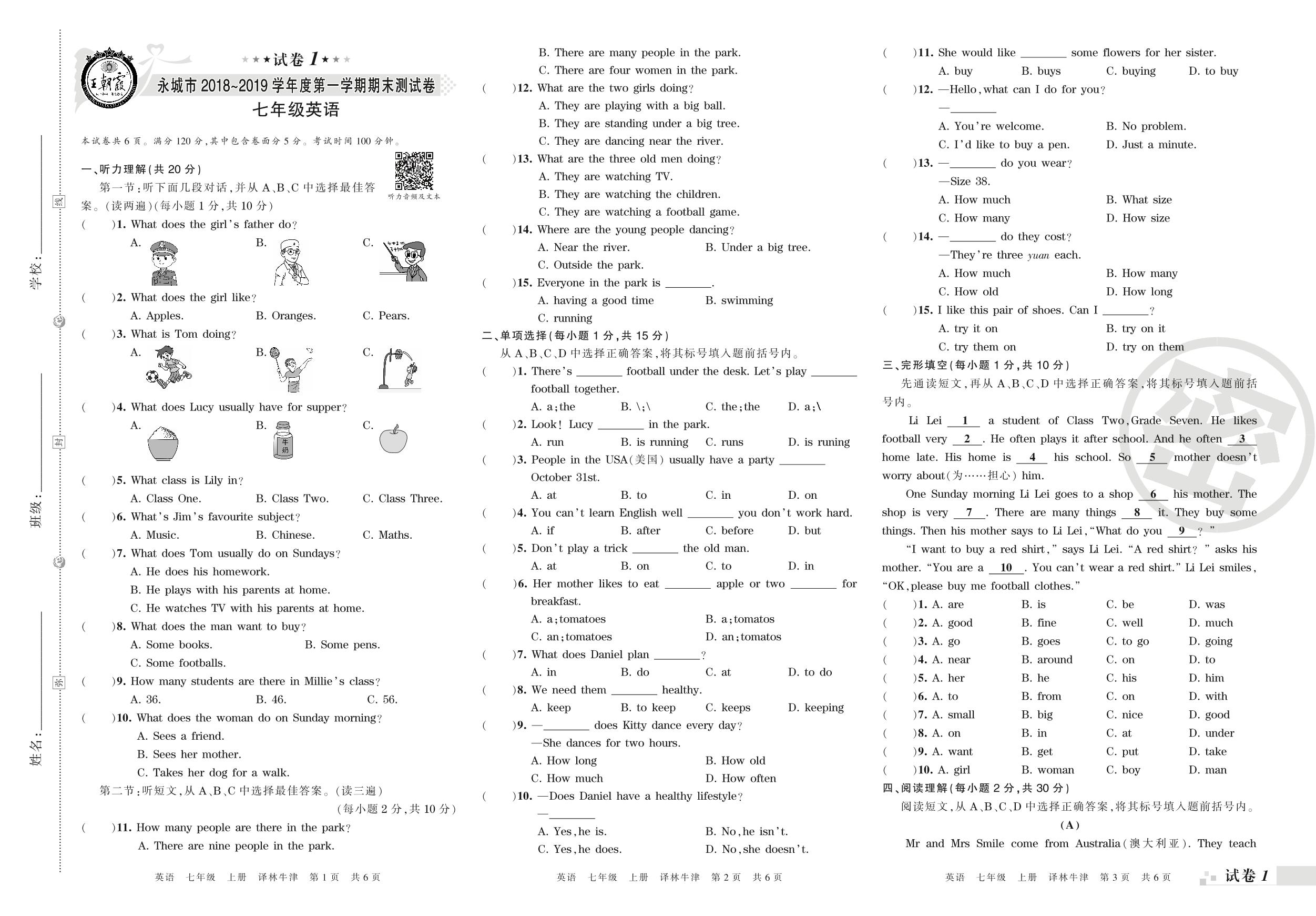 七年级英语译林版(译林牛津版)上册期末卷
