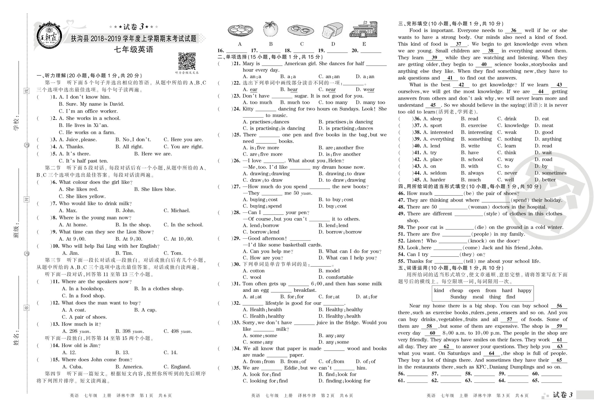 2018-2019学年第一学期周口市扶沟县七年级英语试卷(译林版)【3】