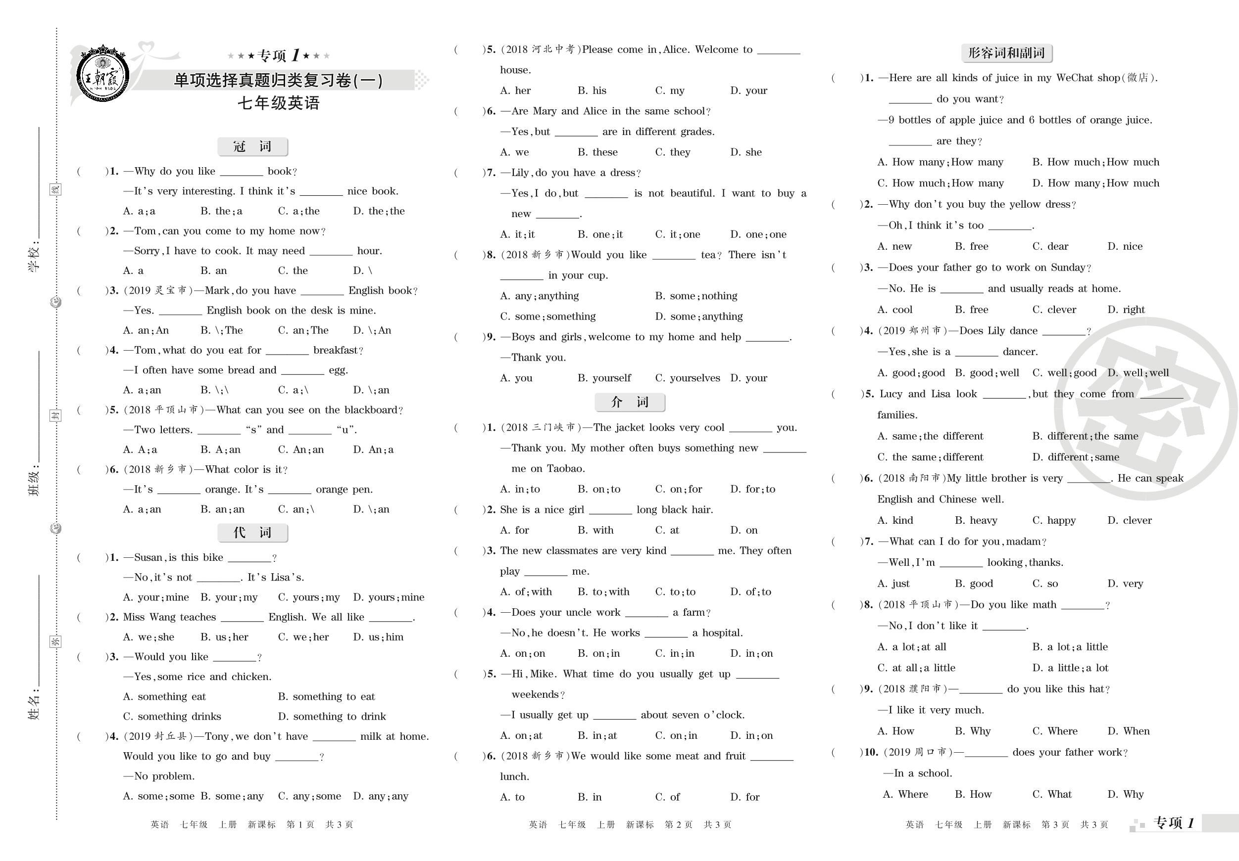 王朝霞期末专项卷——单项选择真题归类复习七年级上册英语(新课版)_R210807201348【0】