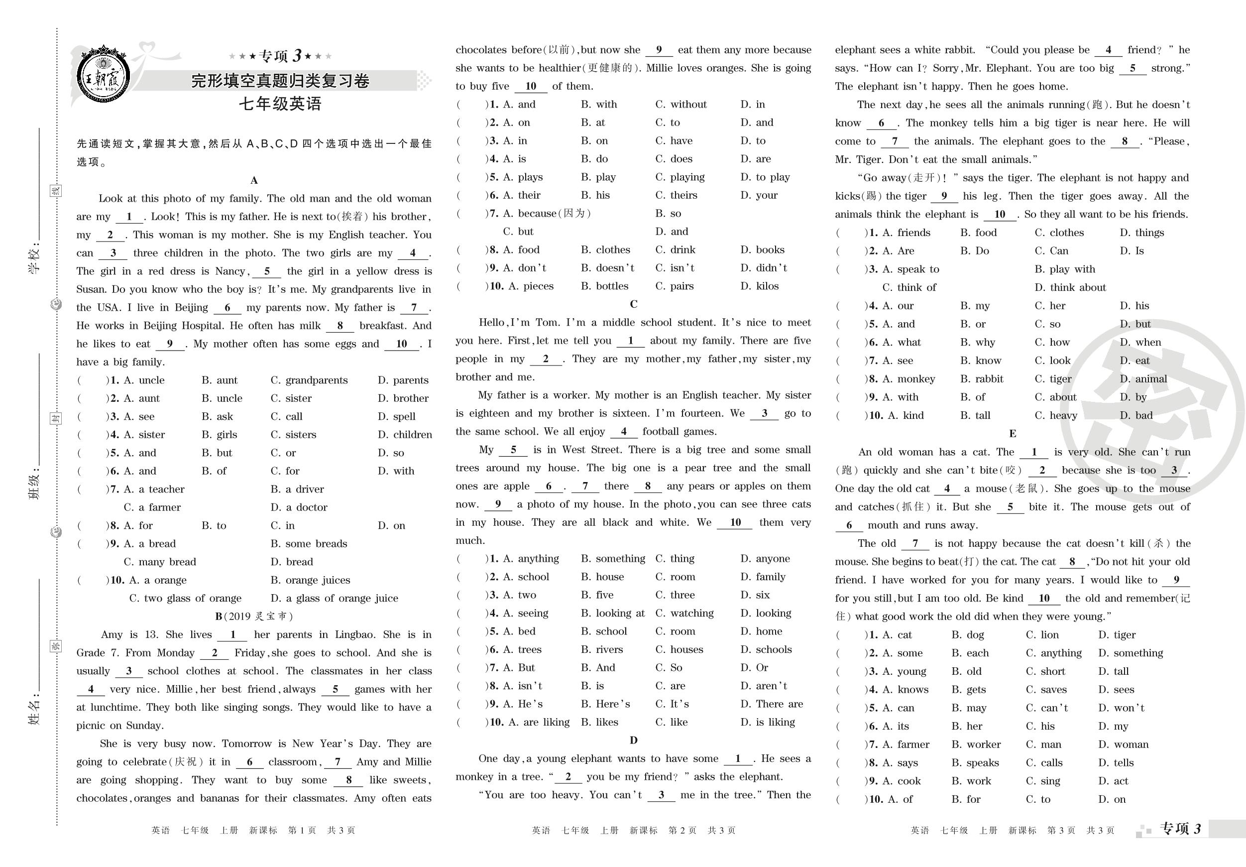 王朝霞期末专项卷——完形填空、选择型阅读真题归类复习七年级上册英语(新课版)_R210807201353【0】