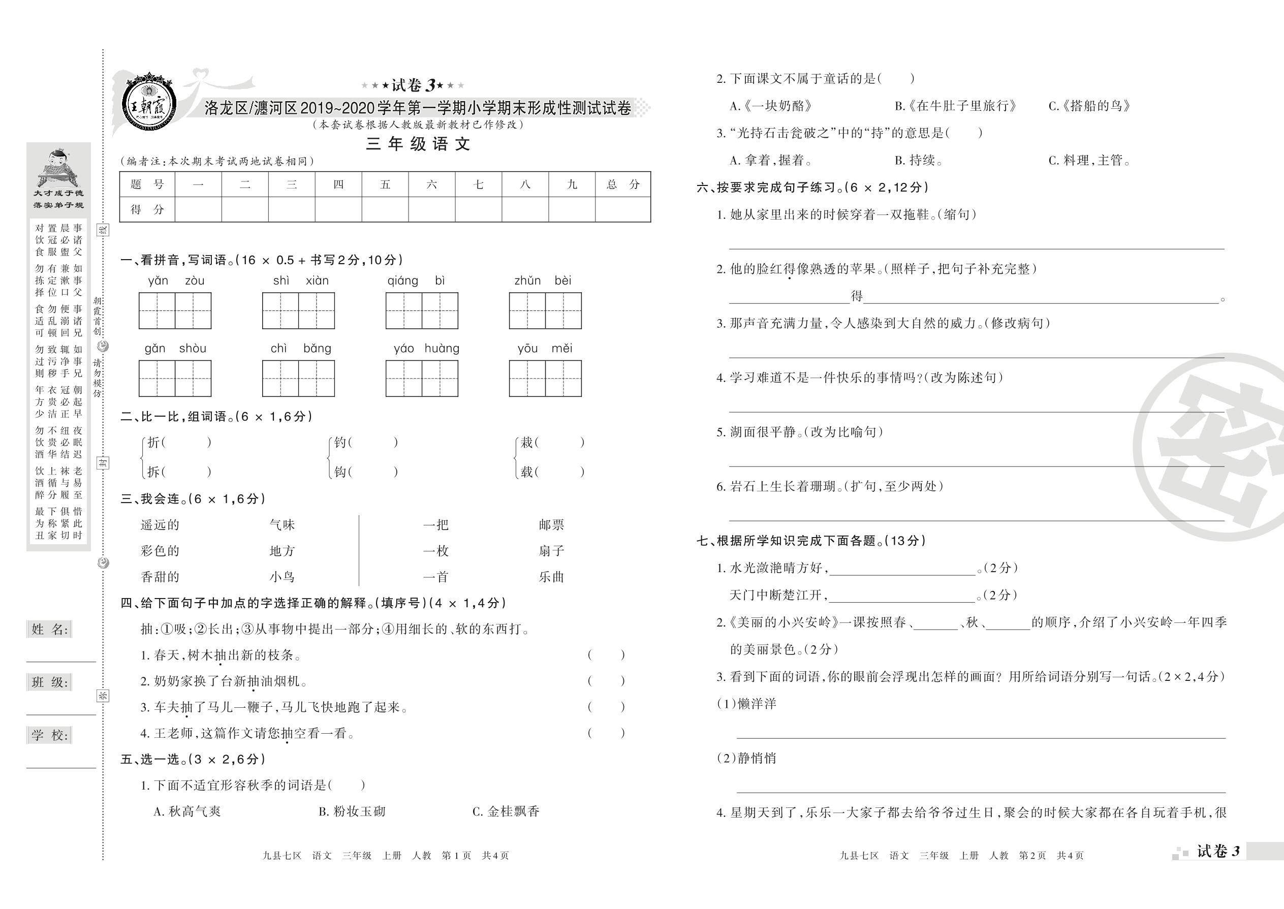 2019-2020学年第一学期洛阳市洛龙区、瀍河区三年级语文试卷(人教版)【3】