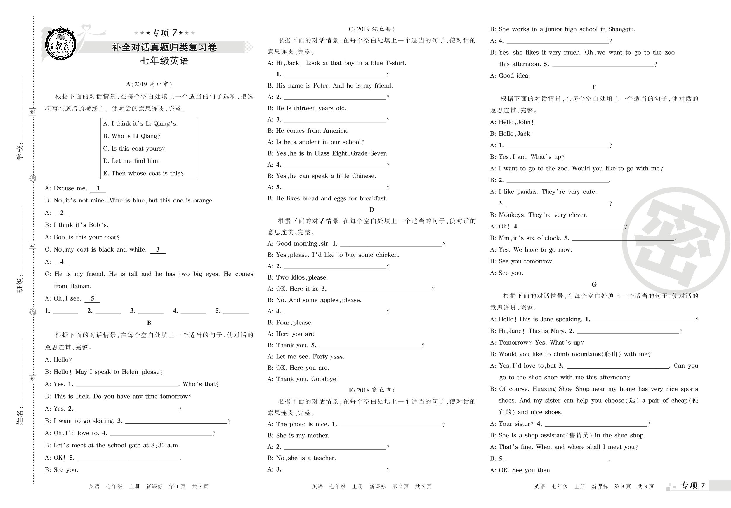 王朝霞期末专项卷——补全对话、书面表达真题归类复习七年级上册英语(新课版)_R210807201405【0】