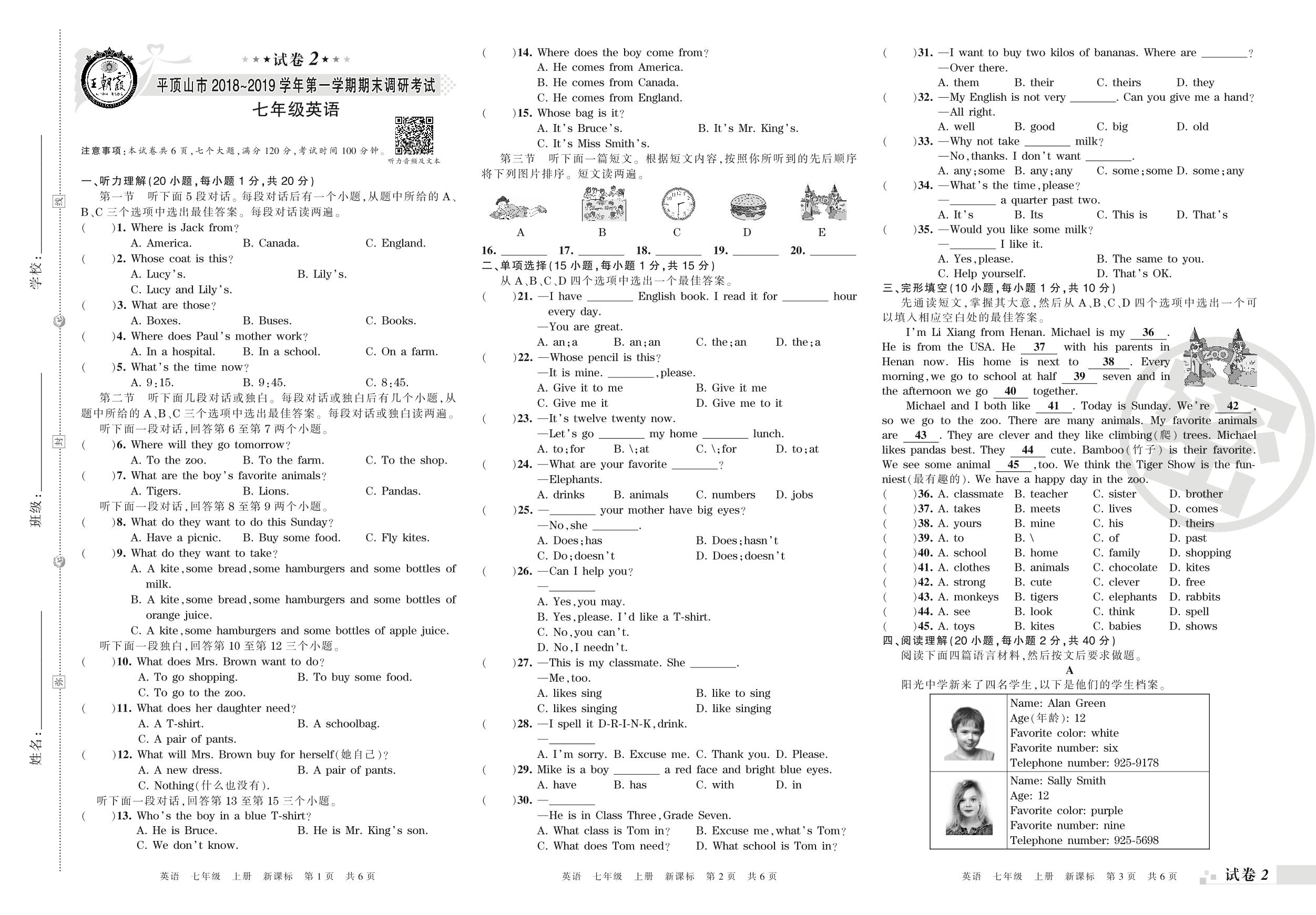 2018-2019学年第一学期平顶山市七年级英语试卷(新课版)【2】