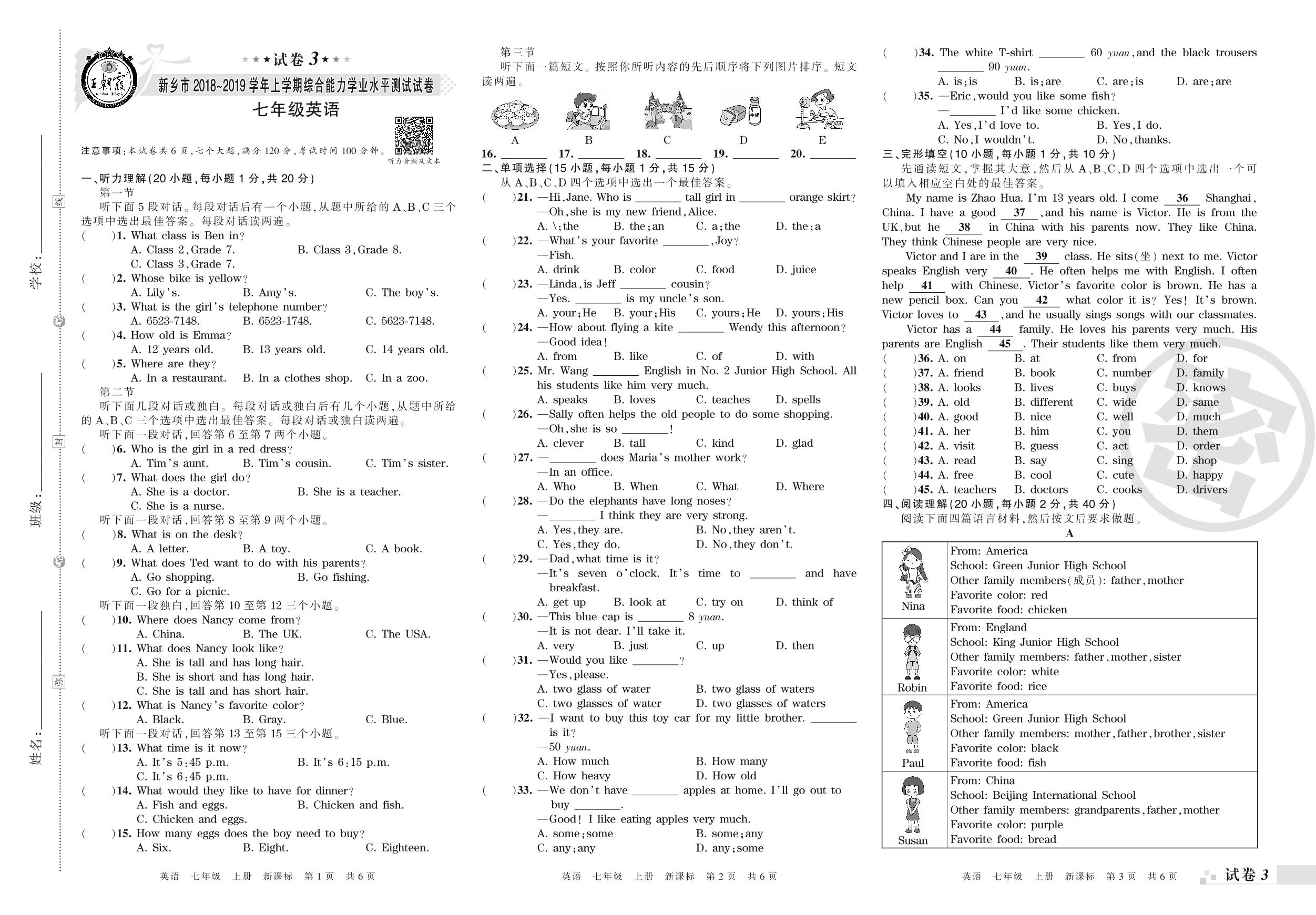 2018-2019学年第一学期新乡市七年级英语试卷(新课版)【3】