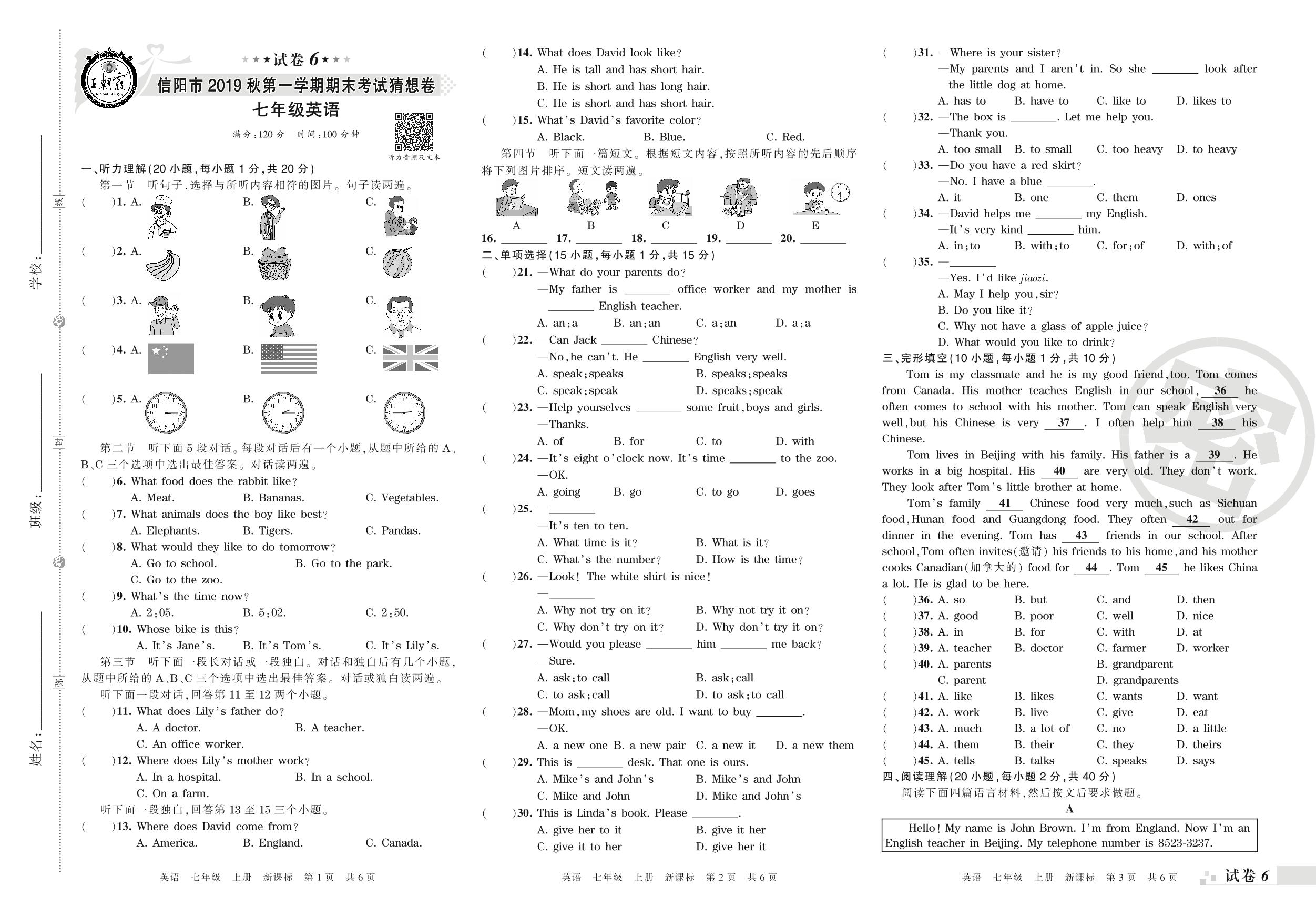 2018-2019学年第一学期信阳市猜想卷七年级英语试卷(新课版)【6】